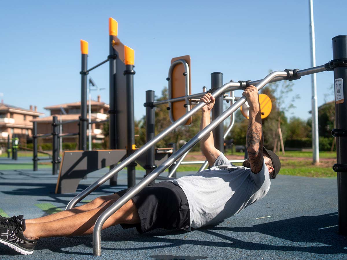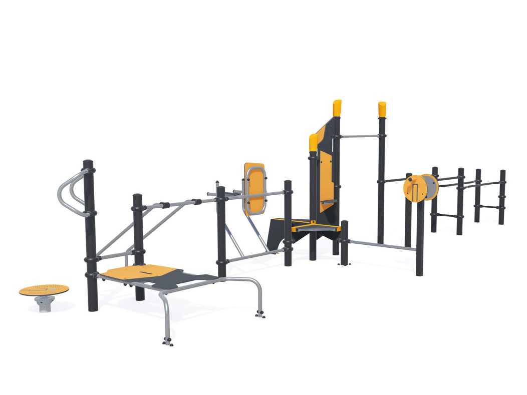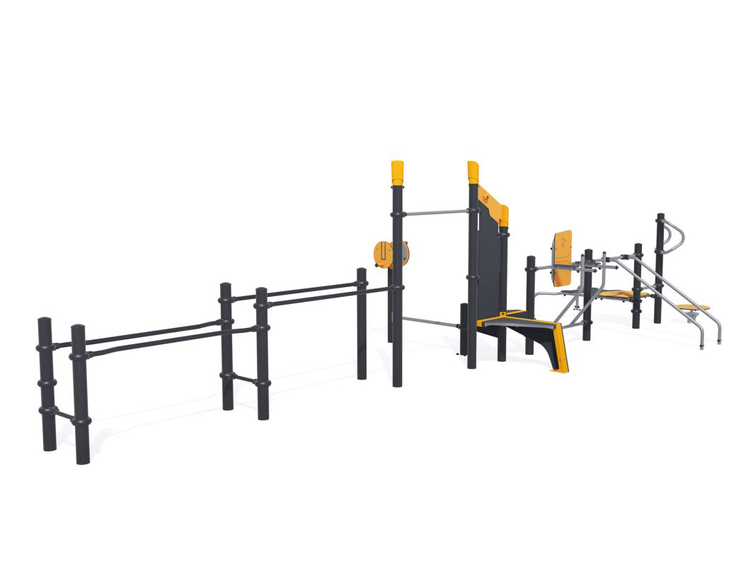 Estação desportiva e intergeracional, permitindo a execução de diferentes tipos de actividades (balançar, suspender, flexões de braços, fundos, flexões, abdominais, pedalar e girar), composta por uma prancha de equilíbrio com pegas metálicas para apoio de mãos, uma prancha horizontal com barra metálica de apoio para flexões e abdominais, um módulo composto por 2 barras paralelas inclinadas para flexões, duas barras com apoios de braços e costas para fundos e abdominais, um módulo pequeno com assento, um Totem com cabide para dependurar casacos e banco, uma barra horizontal com 125cm, 2 conjuntos de barras paralelas duplas mistas, um conector estação de vitalidade, mais uma barra horizontal com 125cm e uma bicicleta de braços. Ideal para a prática desportiva, fortalecimento muscular, fortalecimento da saúde cardiovascular, equilibrar, coordenação motora e socializar.