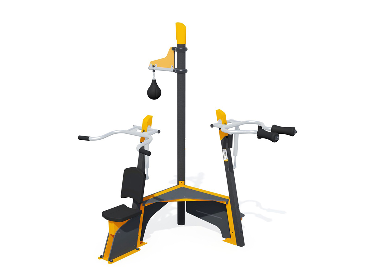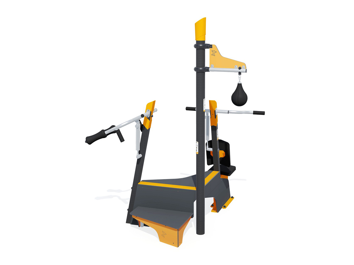 Estação lúdica e desportiva, permitindo a execução de diferentes tipos de atividades (balançar, saltar, flexões de braços, agachamentos, fundos, boxing, treino de resistência, levantar), composta por um módulo Step, um poste com uma bola de boxe suspensa, um módulo de agachamentos, um puxador de ombros e um banco. Inclui placas com instruções de utilização e sugestões de exercícios. Ideal para a prática desportiva, fortalecimento muscular, fortalecimento da saúde cardiovascular, equilibrar, coordenação motora e socializar.