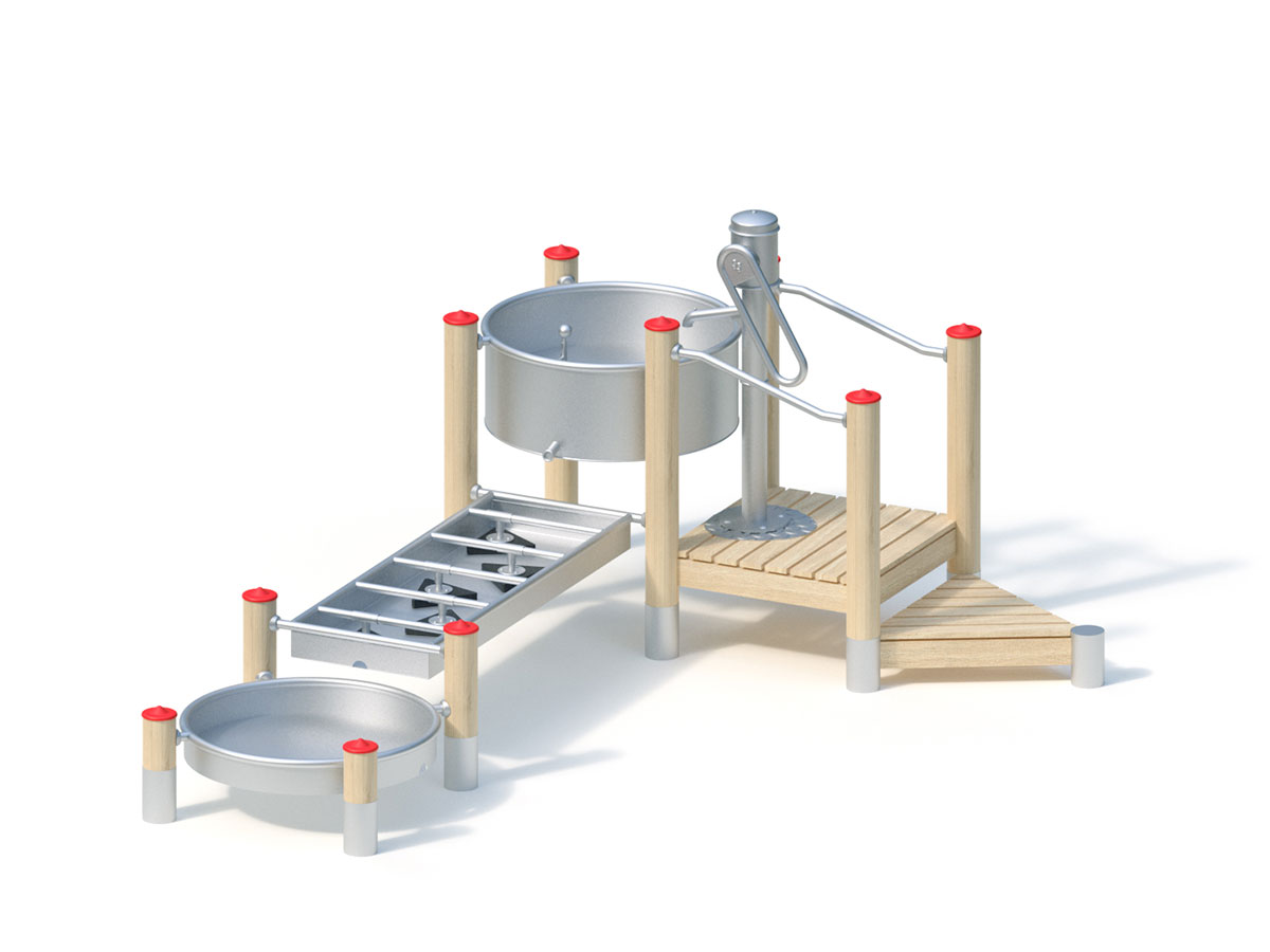 Equipamento para brincadeiras com água, composto por 10 postes de madeira de Robínia, uma plataforma (0,80m x 0,80m) com acesso por um degrau triangular e com uma bomba de água com manípulo ligada a um sistema de bacias, formado por 1 bacia de armazenamento circular elevada com tubo de saída de água, uma mesa redemoinho de água (formada por um tabuleiro/bacia retangular, com 5 placas triangulares ajustáveis para obstrução do fluxo de água) e uma bacia coletora modular, para instalação em terraços, com tubo de descarga. Equipamento ideal para estímulo sensorial e cognitivo e encorajar a interação social. Fixação ao solo em 11 sapatas de betão de 0,40×0,40×0,40m.