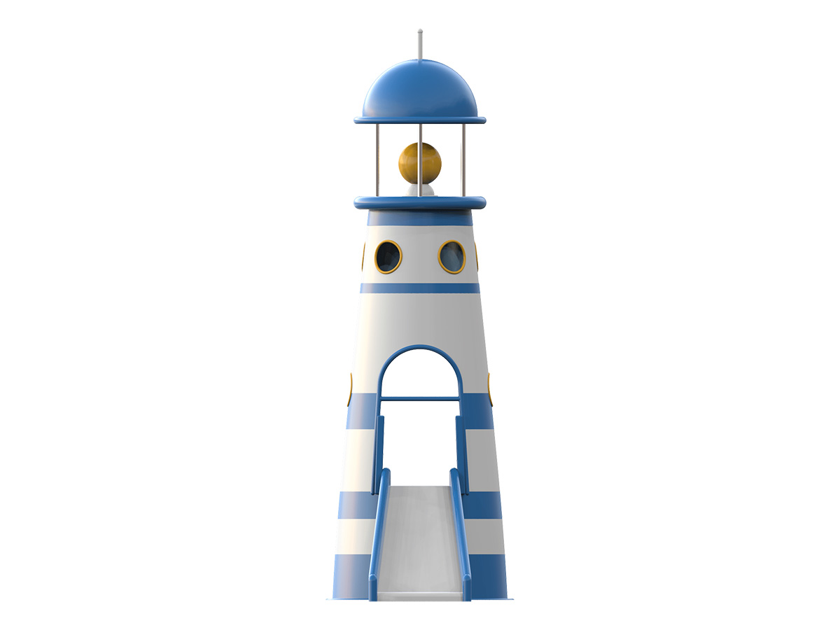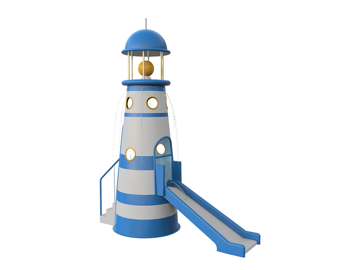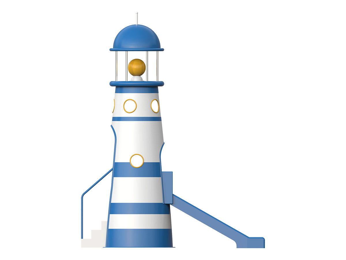 Torre de atividades para parque aquático e/ou para colocar na entrada de piscinas de criança com profundidade máxima de 300mm. Com a forma de um farol, a subida é feita por umas escadas nas traseiras, as quais dão acesso a uma plataforma, com saída por um escorrega reto aberto. Inclui também diversos jatos de água. Equipamento fabricado na Europa, de acordo com as Normas Europeias EN 1069, 1176, 13451 e 17232, certificado pela TUV.