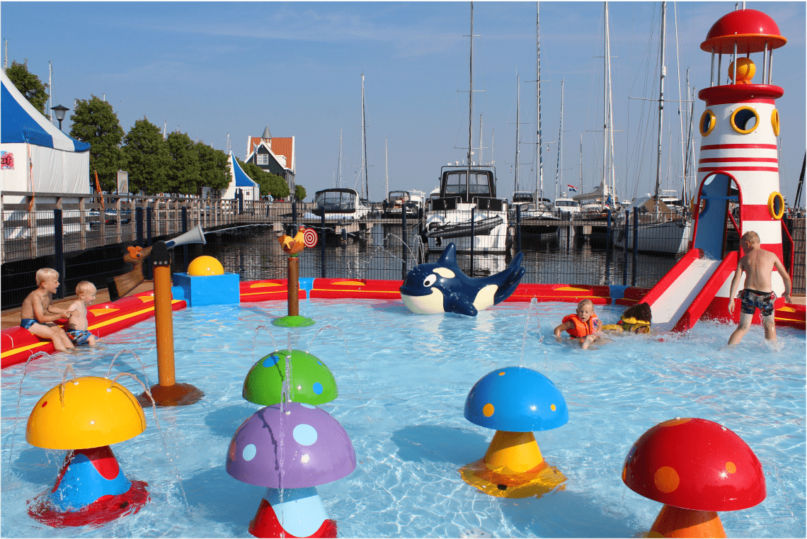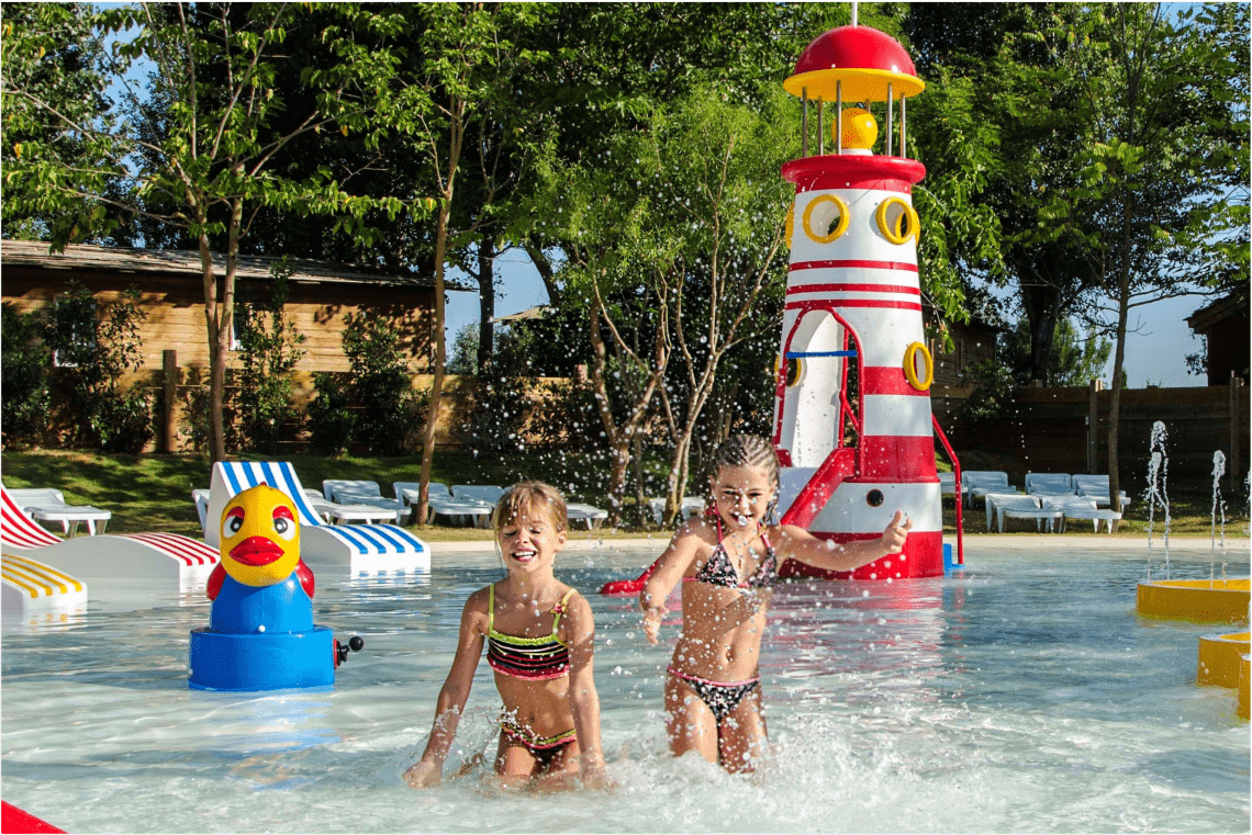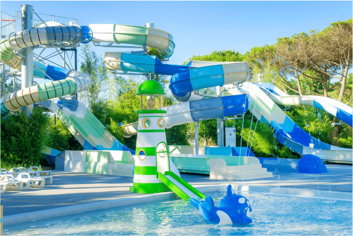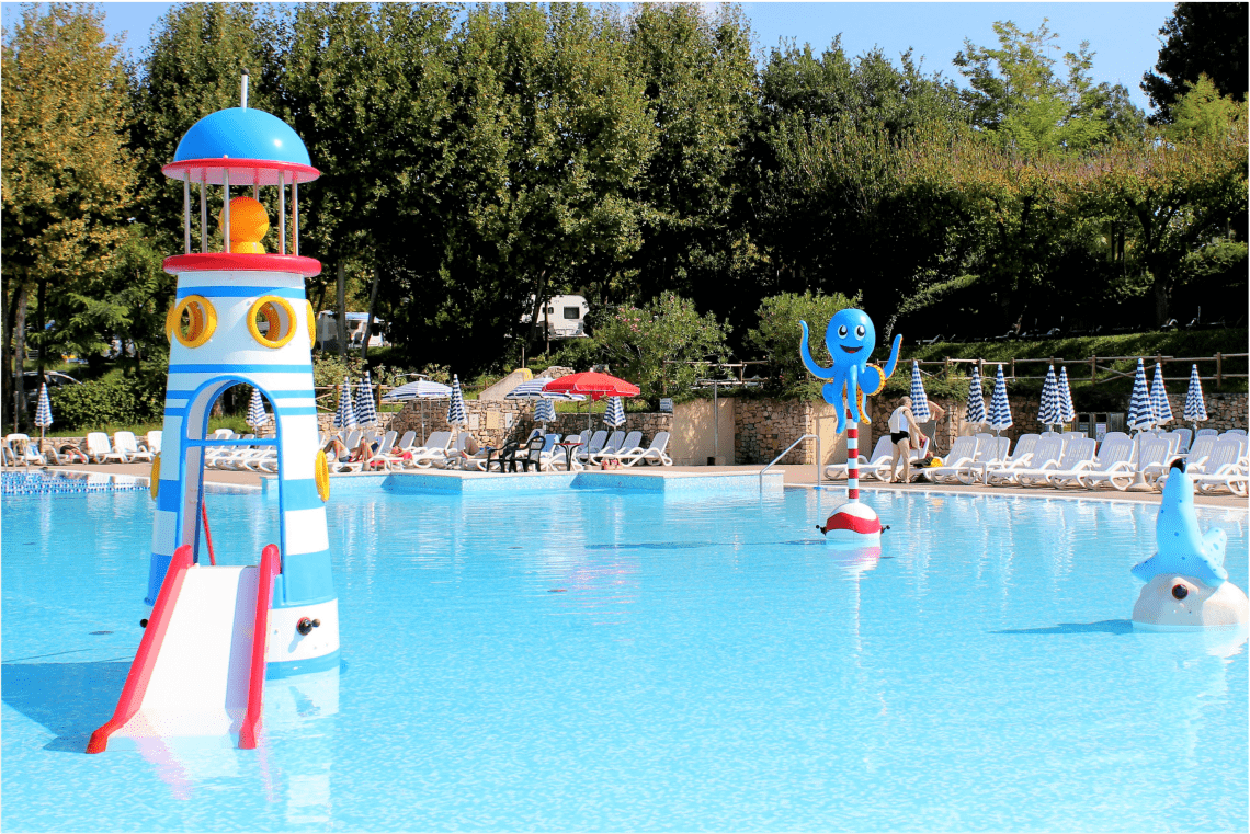 Torre de atividades para parque aquático e/ou para colocar na entrada de piscinas de criança com profundidade máxima de 300mm. Com a forma de um farol, a subida é feita por umas escadas nas traseiras, as quais dão acesso a uma plataforma, com saída por um escorrega reto aberto. Inclui também diversos jatos de água. Equipamento fabricado na Europa, de acordo com as Normas Europeias EN 1069, 1176, 13451 e 17232, certificado pela TUV.