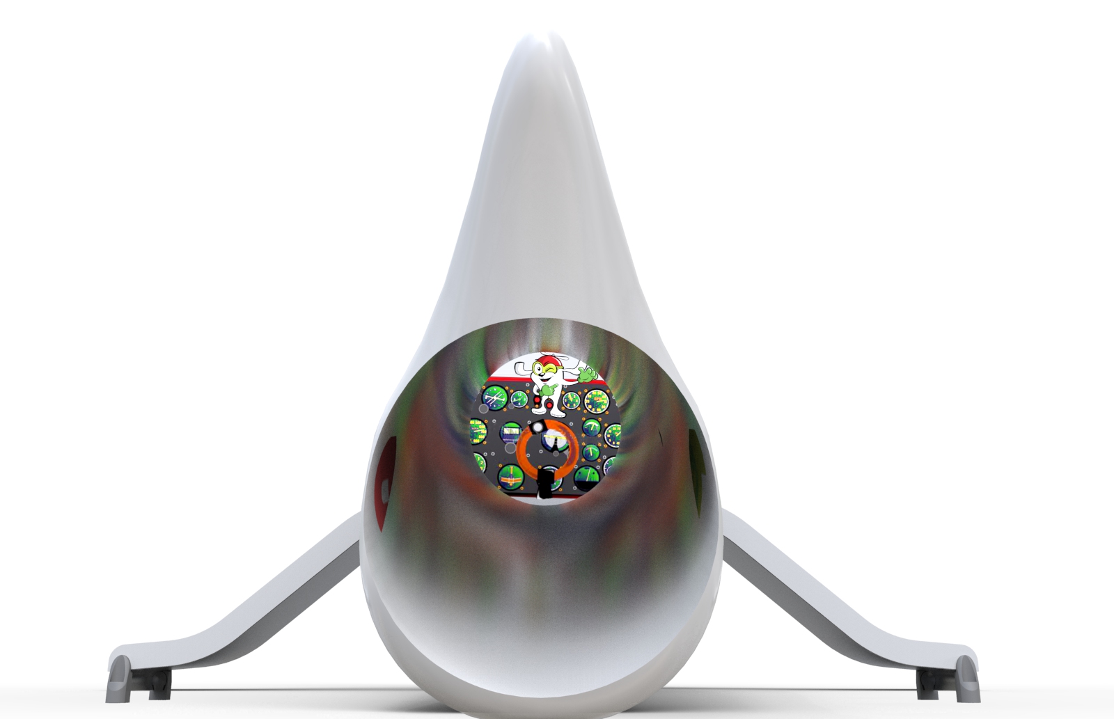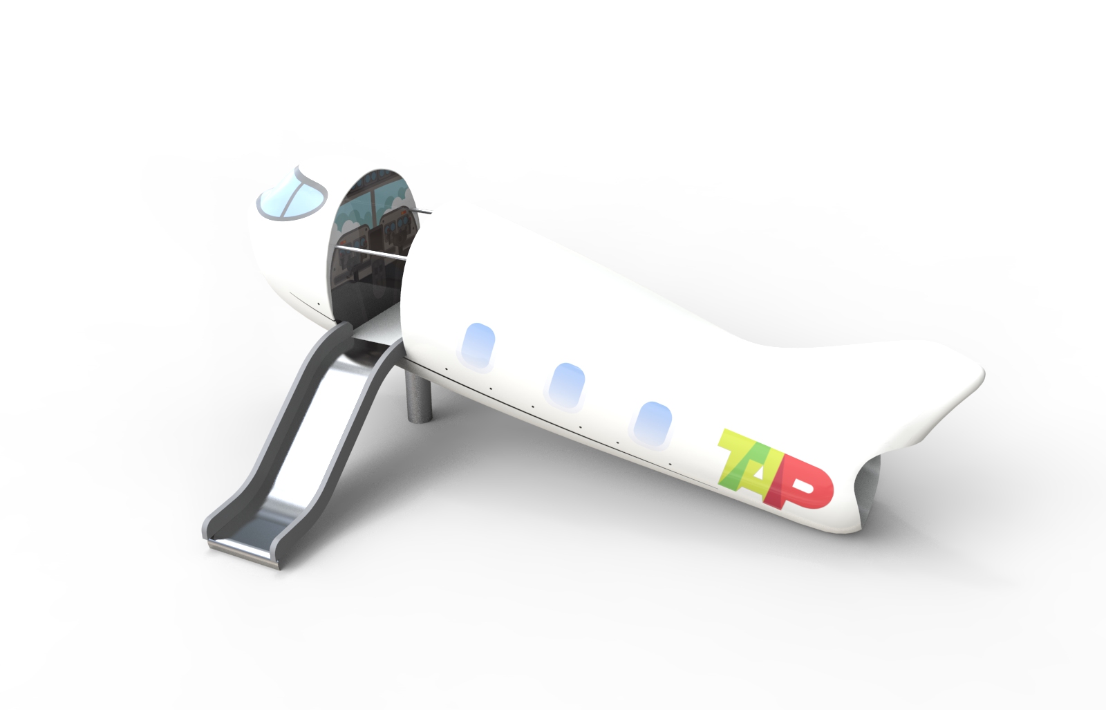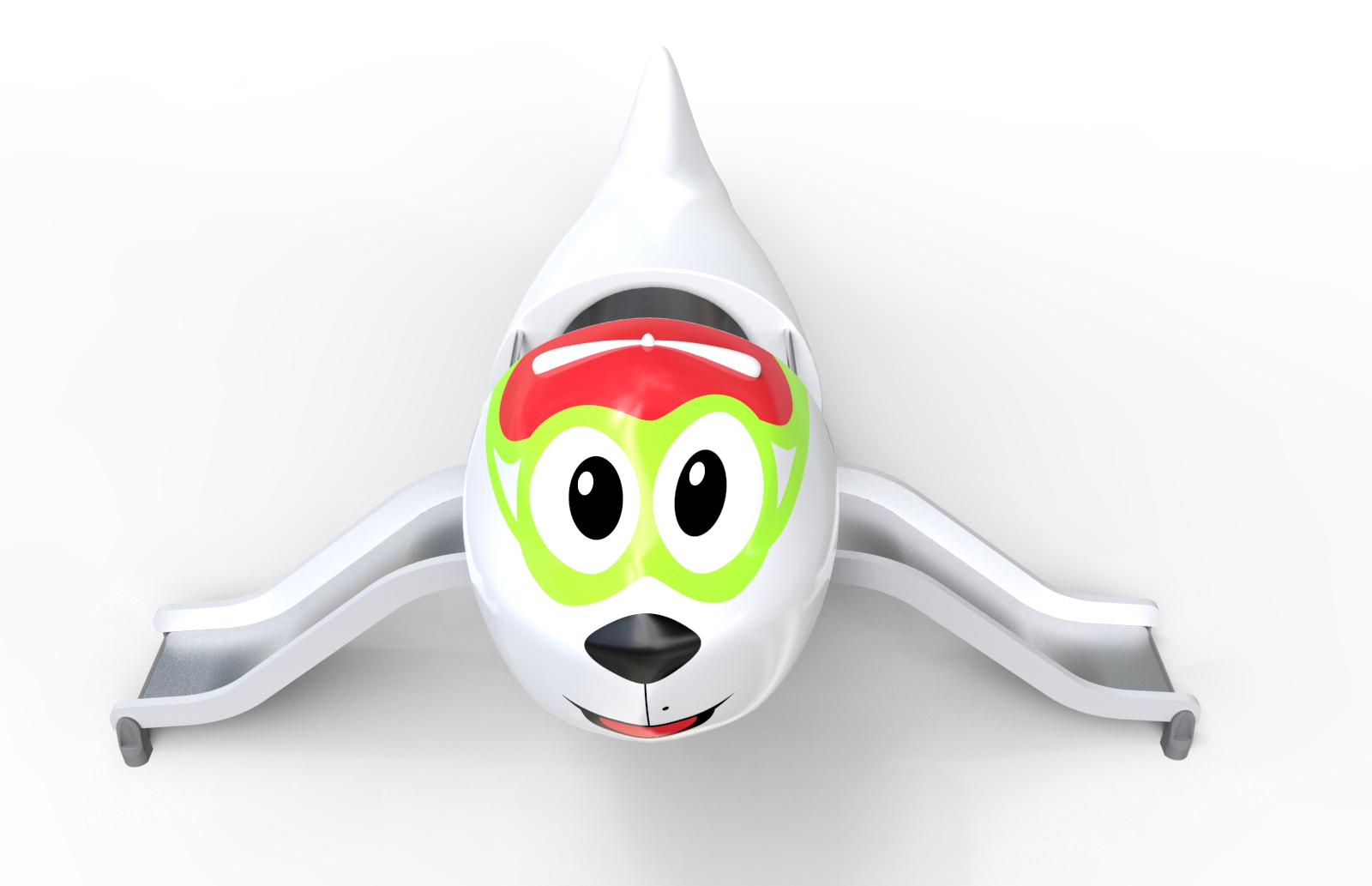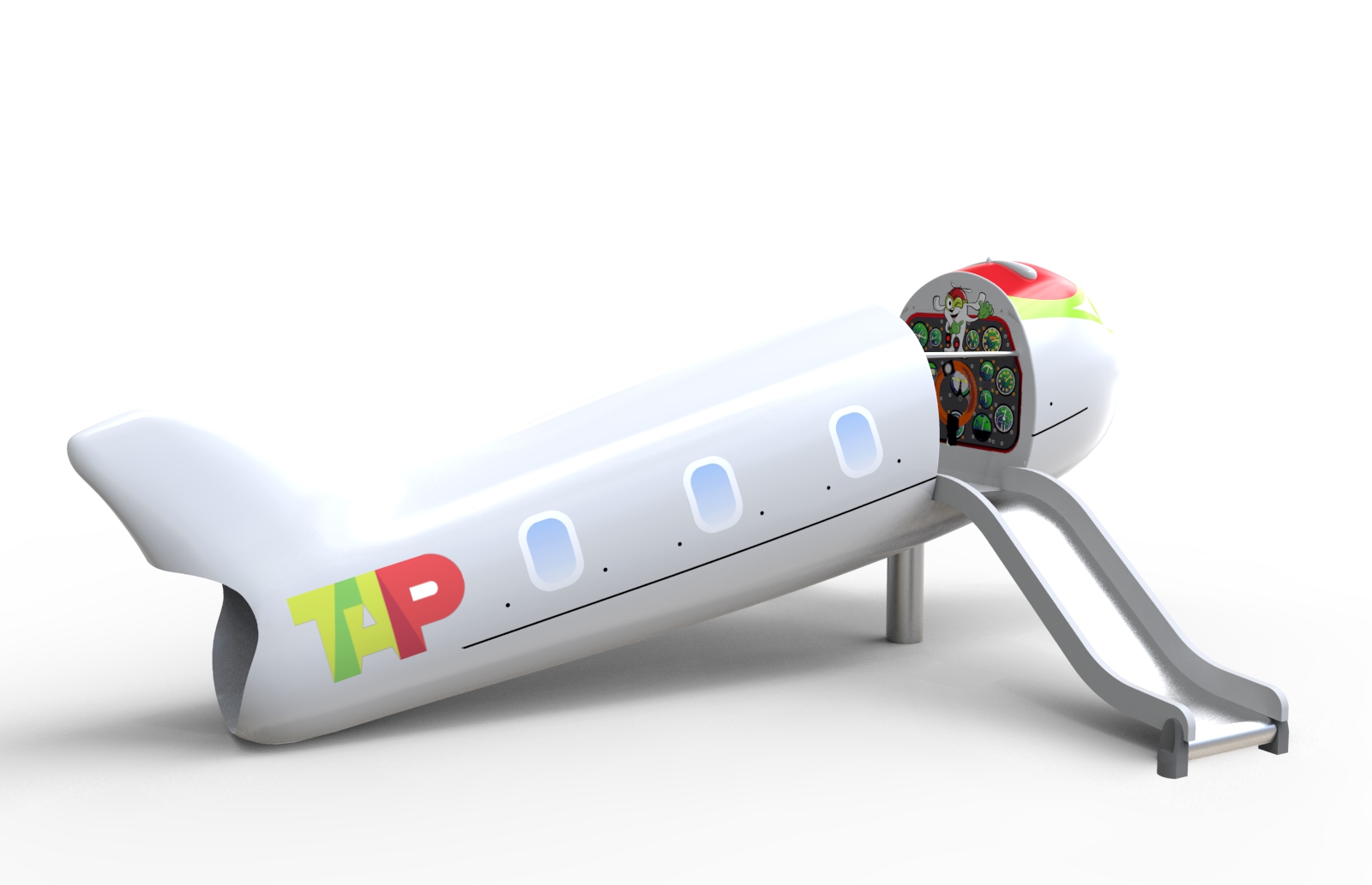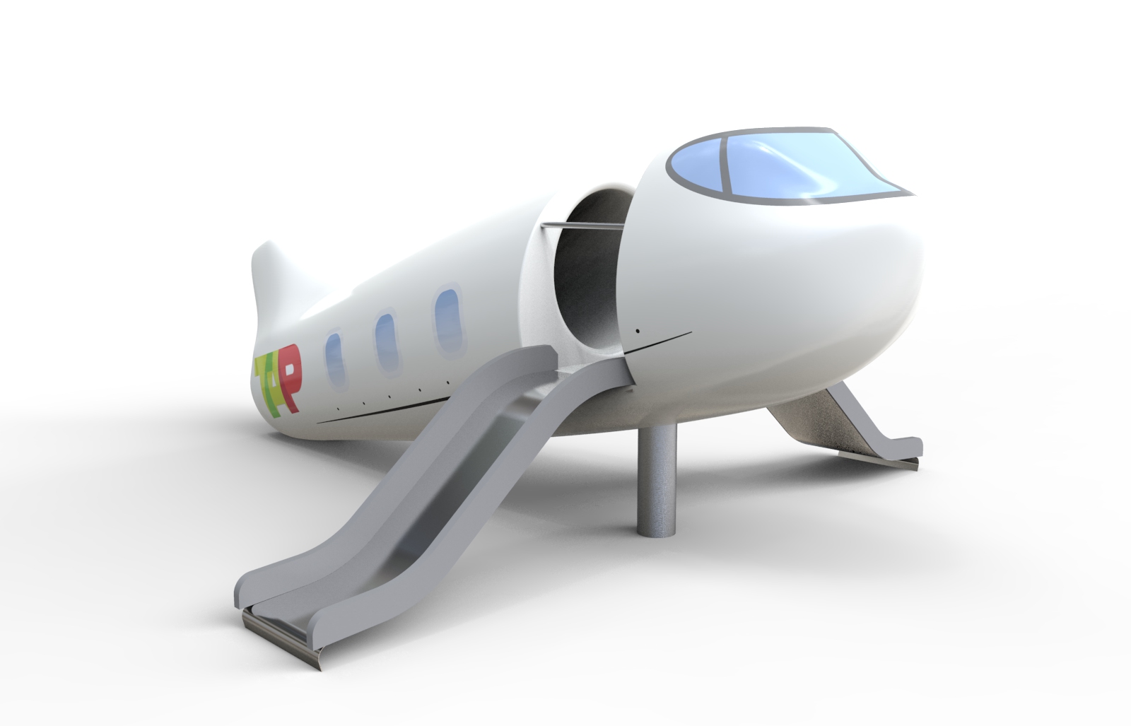 Equipamento temático PLAY IN ART® com a forma 3D de uma mascote de avião. Acesso ao interior por um túnel de atividades na traseira do avião; cockpit com um volante interativo com conteúdo áudio produzido por dínamo no interior e saída nas laterais por dois escorregas em forma de asas. Para trepar, escorregar, socializar, role play e como elemento decorativo de arte urbana. Disponível em várias cores RAL conforme pedido (nota: metalizados e cores especiais com acréscimo de preço).
