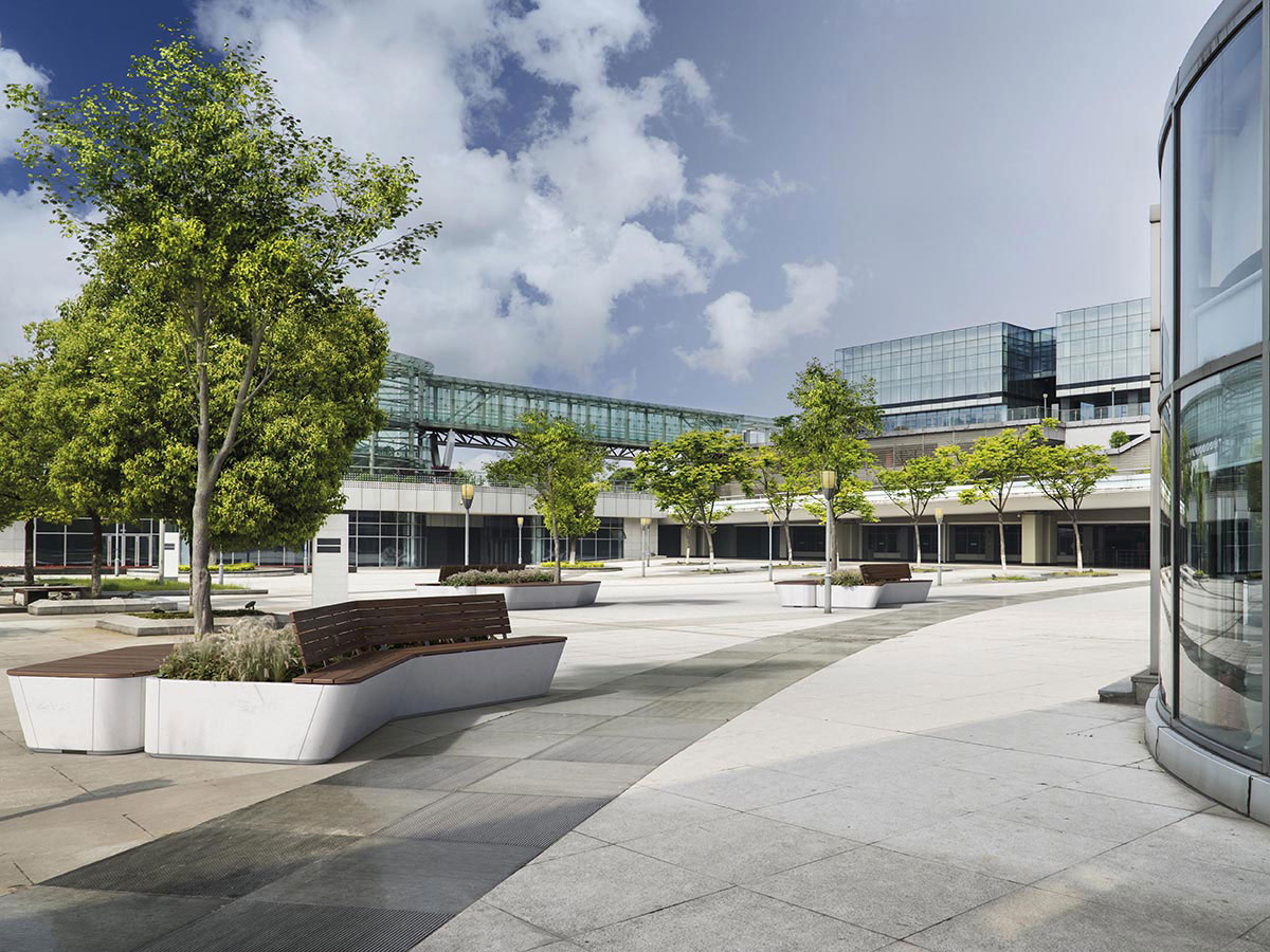 Floreira modular em chapa de aço, que pode ser instalada individualmente ou em composição, com outros modelos da mesma linha, compondo diferentes formas. Este modelo é composto por uma frente lisa e outra frente com uma reentrância, de perfil côncavo com assentos e apoios de costas em madeira dura ou de lariço. Autoportante, sem necessidade de fixação ao solo.