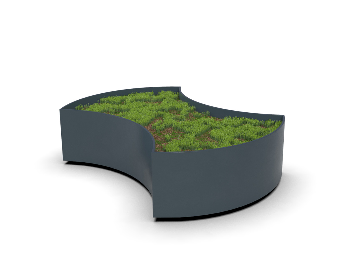 Floreira alta em chapa de aço dotada de moldura perimetral em chapa de aço, que funciona como base de apoio regulável. A colecção modular permite combinar os diferentes elementos, disponíveis em duas versões, uma côncava e outra convexa, e em duas alturas diferentes. Os elementos podem ser complementados com assento de madeira vendido em separado (ref. PMT 0012804 e PMT 0012814).