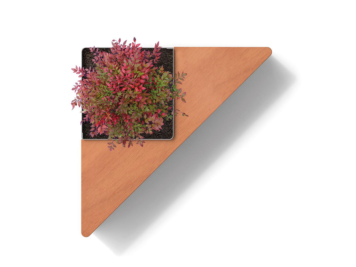 Floreira modular em aço equipada com sistema integrado de assentos em contraplacado de Okumé envernizado. Este modelo apresenta uma forma triangular composta por uma abertura em forma quadrada para colocação de plantas e dois assentos triangulares. Pode ser instalado individualmente ou em composições criativas com outros modelos da mesma linha, Floreira Dupla Triangle com Assento (Ref. PMT 0301324 ) e Floreira Quádrupla Triangle com Assento (Ref . PMT 0301334 ), vendidos em separado.