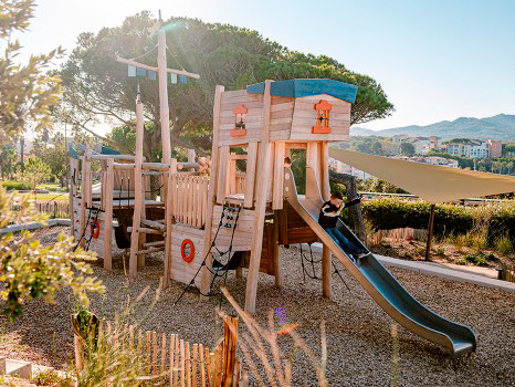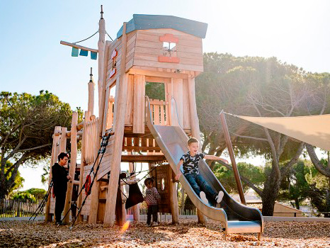 Materiais: Os postes e os painéis são feitos de robínia sem seiva e sem casca. A madeira de robínia é lixada e como é naturalmente à prova de podridão não requer nenhuma proteção química adicional. É igualmente extremamente resistente a ataques de fontes externas (insetos, fungos, variações climáticas), garantindo a durabilidade a longo prazo. Os painéis coloridos resultam de um processo de tingimento com tintas à base de água. Os tubos são fabricados em aço inoxidável com 40mm de diâmetro, garantindo durabilidade e confiabilidade do equipamento. As cordas de 16mm de diâmetro são feitas de cabo de aço galvanizado coberto com poliéster. Os cabos são unidos e mantidos no lugar por esferas de poliamida injetada. As fixações para as redes e correntes são feitas de alumínio. Os acessórios da rede são feitos de poliamida. Os acessórios são compostos por duas partes distintas para facilitar a manutenção de fios individuais. O escorrega é feito de aço inoxidável. O assento é feito de borracha com 13mm de espessura. O telescópio é feito de aço inoxidável. Fixações de aço inoxidável ou banhado, protegidas por tampas antivandalismo em poliamida.
