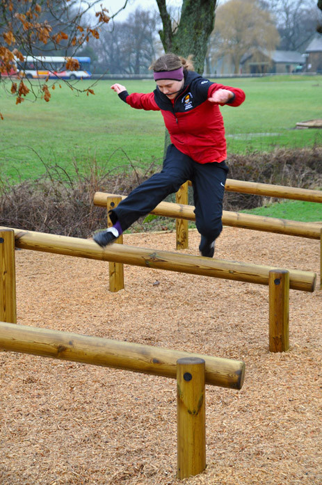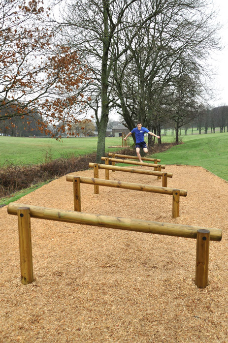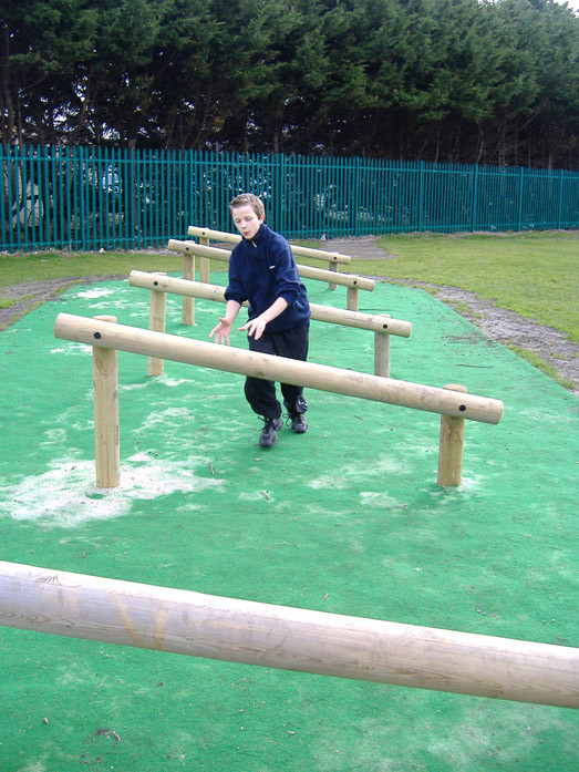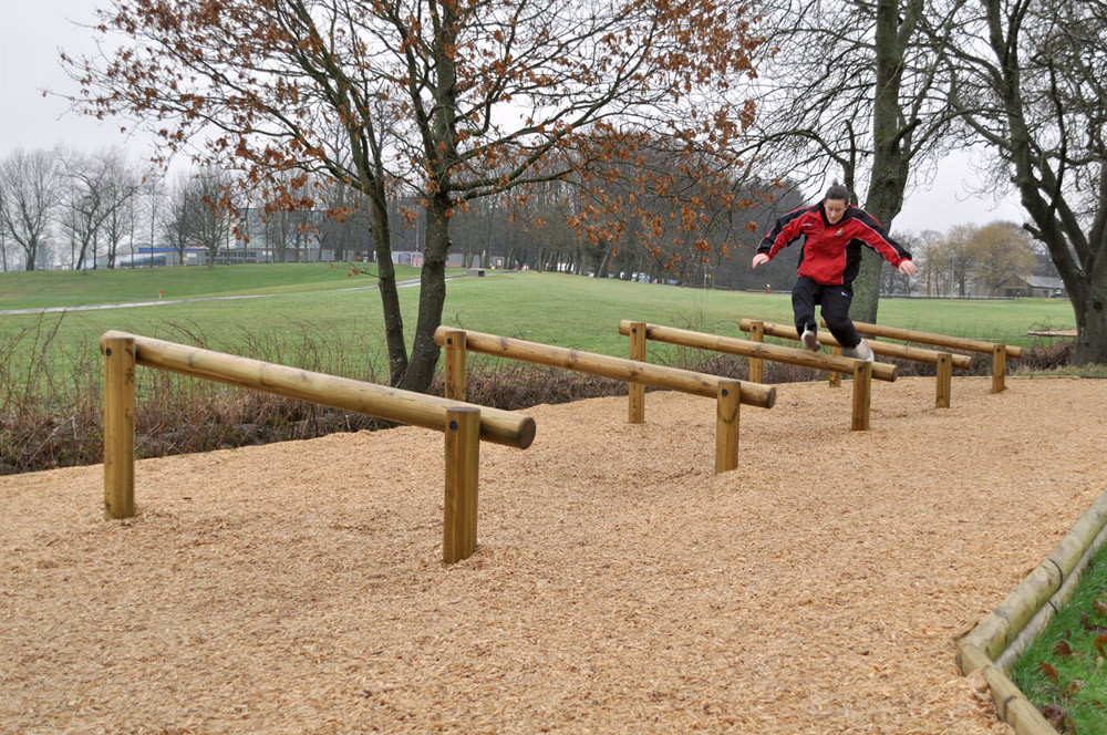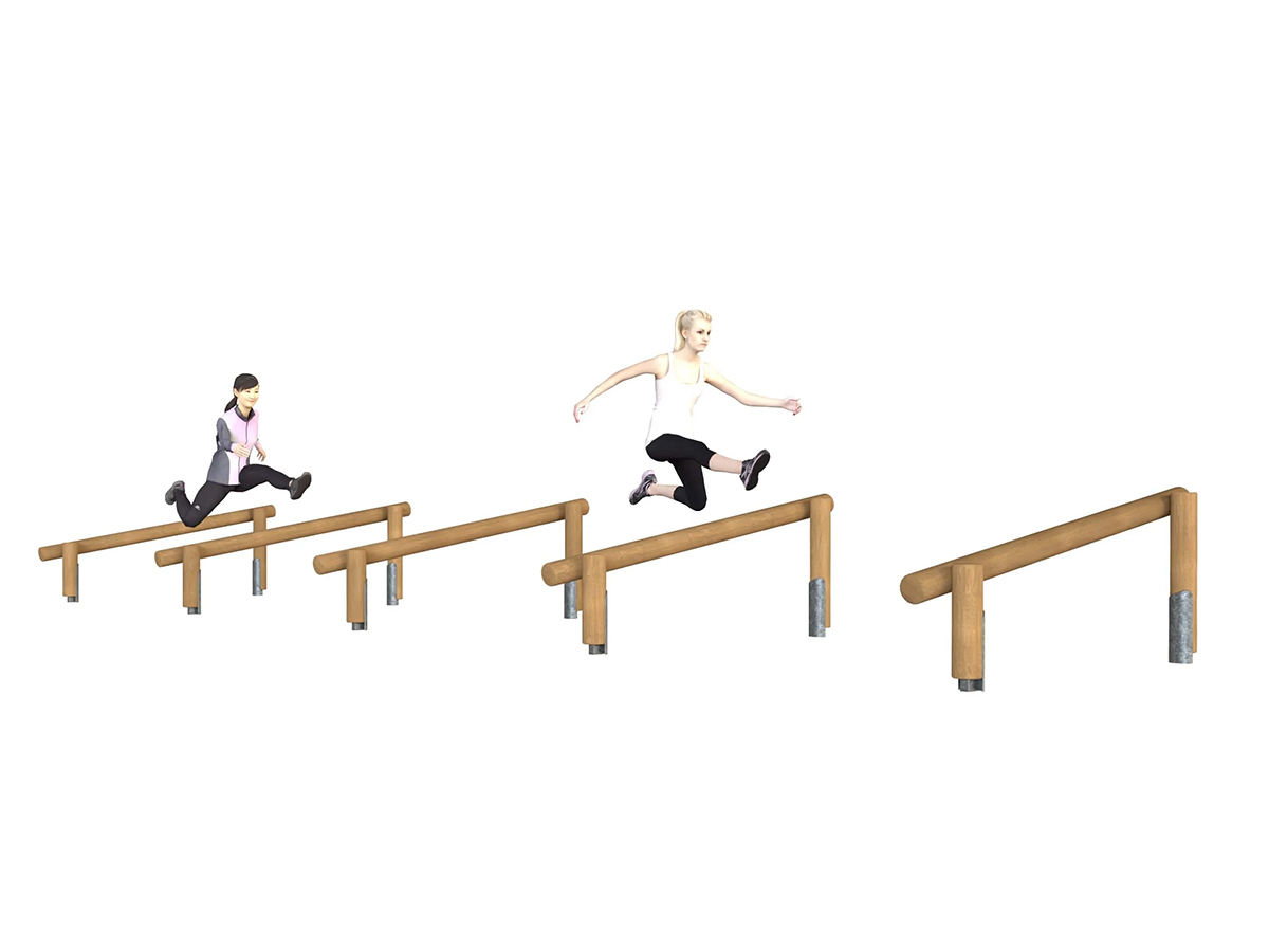 Equipamento para treino de saltos, coordenação motora, agilidade e superação de obstáculos. Composto por 5 obstáculos compostos por 1 poste circular horizontal e inclinado, fixo a 2 postes circulares verticais com diferentes alturas (0,48m e 0,84m).