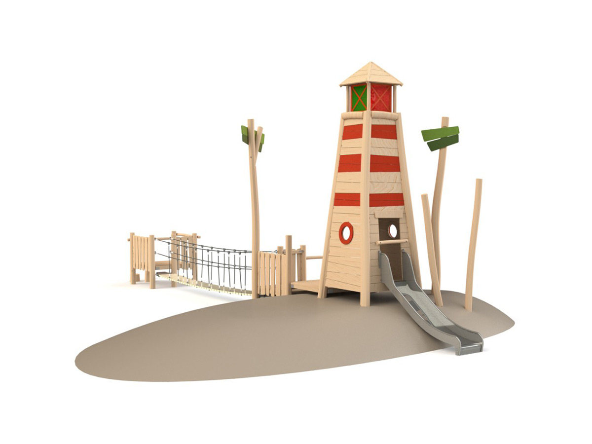 Centro de atividades temático, feito em madeira de robínia, composto por um grande farol elevado, com escorrega metálico (0,97m de altura), 2 janelas circulares para espreitar, acesso por 3 plataformas e por uma ponte oscilante, com guardas feitas em corda, ligada a uma plataforma (0,57m de altura) com guardas e acesso por 3 degraus em forma de troncos cortados com diferentes alturas. Inclui ainda dois troncos simples e dois troncos com painel em forma de árvore ajudando a criar a envolvente da “ilha”. Ideal para brincar ao “faz de conta”, escorregar, atravessar, esconder, abrigar, equilibrar, descansar, manusear, equilibrar, socializar, superação de obstáculos e estímulo sensorial e cognitivo. Para fixação a sapatas de betão. Para ser instalado num pequeno talude.