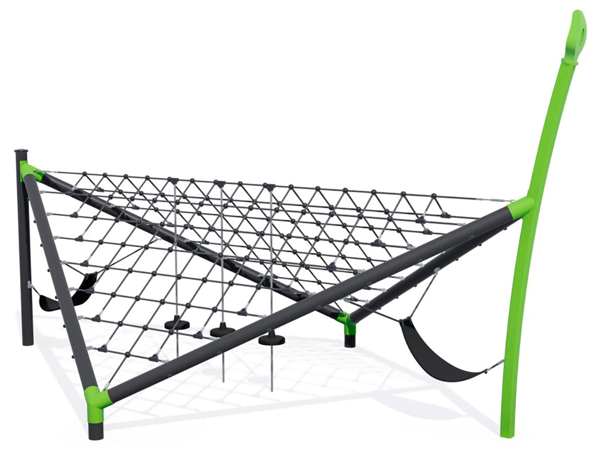 Materiais: Os postes de 125 mm de diâmetro são feitos de aço galvanizado pintado, garantindo robustez e durabilidade. As tampas são feitas de poliamida moldada por injeção. Postes de aço galvanizados e pintados 95x95mm, garantem durabilidade a longo prazo. As tampas são feitas de polietileno rotomoldado. As peças de junção são fabricadas em aço galvanizado pintado. As cordas de 16 mm de diâmetro são feitas de cabo de aço galvanizado coberto com poliéster. Os cabos são interligados e mantidos no lugar por esferas de poliamida injetadas. Os acessórios de rede são feitos de poliamida. Os acessórios são compostos por duas partes distintas para facilitar a manutenção de fios individuais. Os discos para trepar são feitos de borracha moldada antiderrapante. Os assentos Hammock são feitos de borracha com 13mm de espessura. As fixações são feitas de aço inoxidável ou banhado e protegidas por tampas de poliamida antivandalismo.