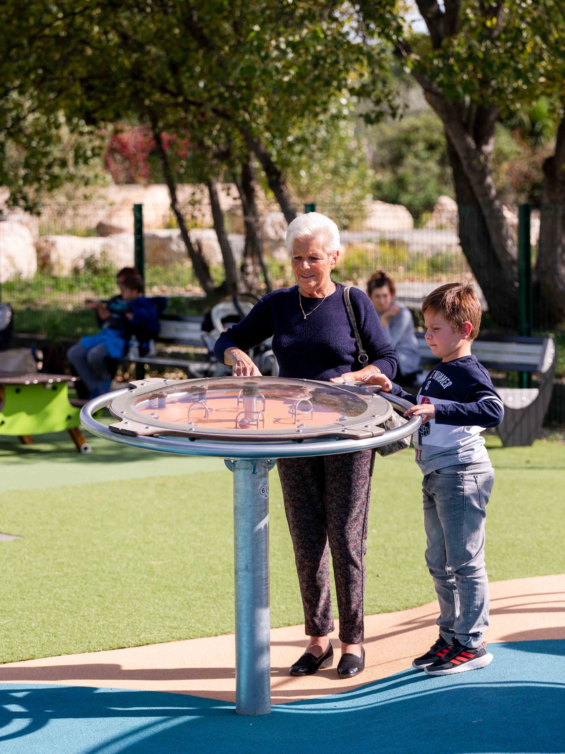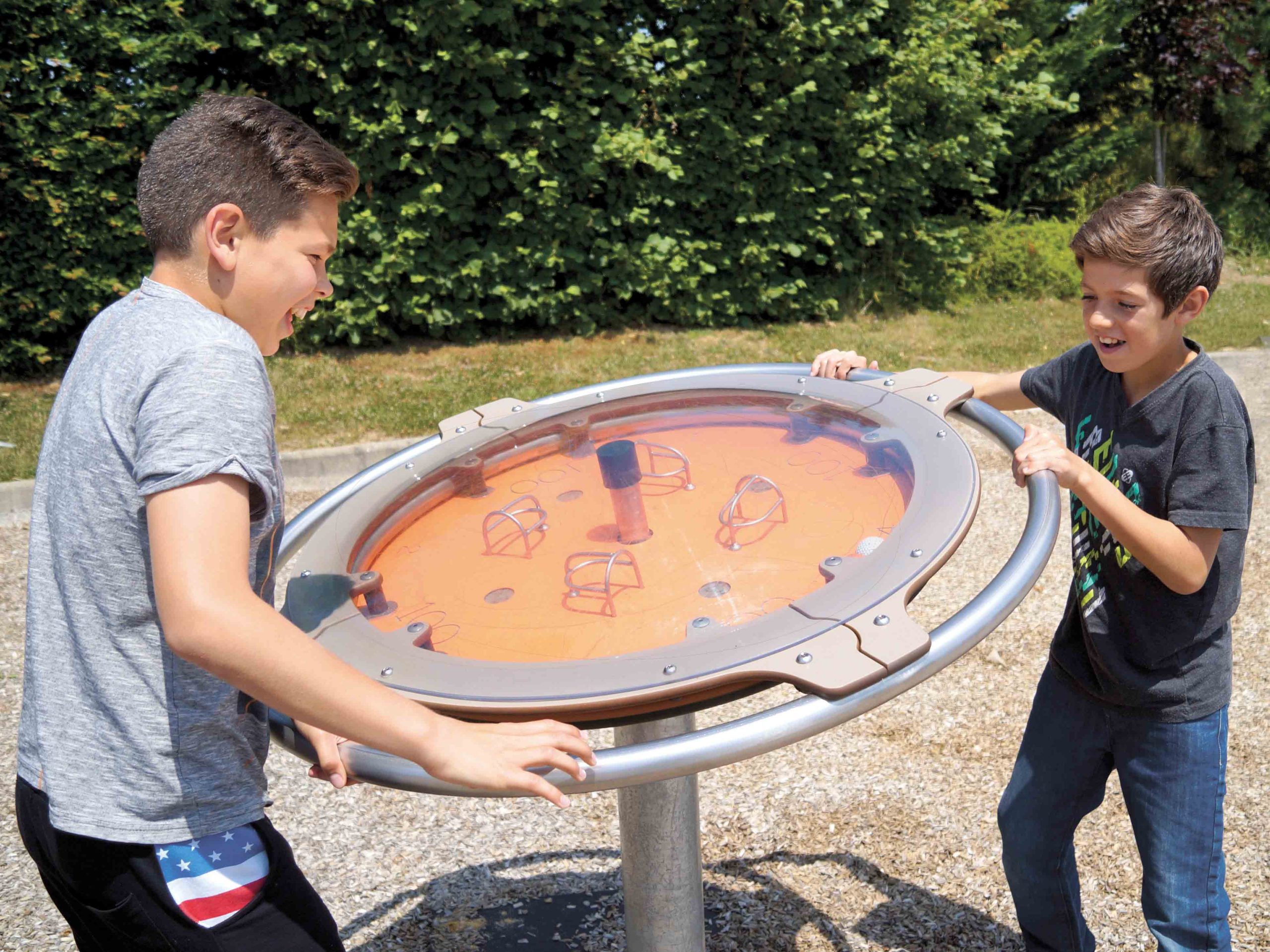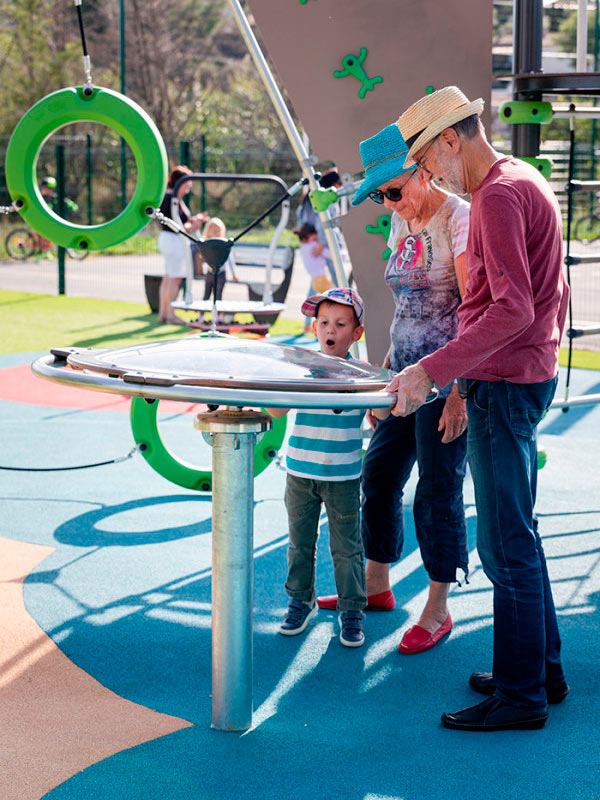 Materiais: Os painéis coloridos são feitos de um material compacto de 13 mm de espessura (HPL). De construção robusta, possui excelentes propriedades de resistência a intempéries e vandalismo. A cúpula de proteção é feita em termoplástico resistente a quebra (PMMA). Os tubos são feitos em aço inoxidável, com 40 mm de diâmetro, garantindo durabilidade e confiabilidade ao equipamento. As fixações são feitas de aço inoxidável ou galvanizado e protegidas por tampas de poliamida antivandalismo.