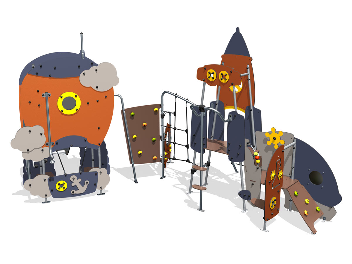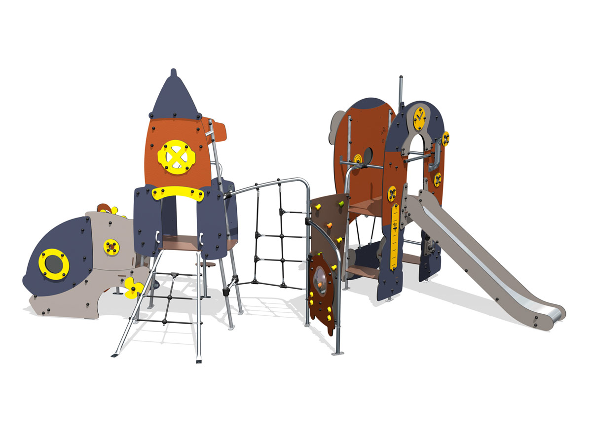 Centro de actividades temático Metropolis, inspirado no espaço, composto por perfis metálicos, painéis decorativos HPL e três torres. Uma das torres tem acesso à plataforma superior por parede de trepar inclinada com presas de escalada, tem ainda 1 parede vertical com jogos de motricidade, 1 leme, 1 painel com o jogo de ábaco, 1 assento e painel decorativo em forma de um Cockpit com vigia. Esta torre encontra-se ligada a outra torre com a forma de foguetão, por um degrau interno. A torre foguetão tem também acesso por uma escada inclinada metálica com degraus de rede e 1 poste dos bombeiros com 3 apoios para pés a alturas diferentes. Esta torre encontra-se ligada a uma parede vertical de perfil metálico com cordas, por sua vez, unida a um1 painel lúdico com um carro espacial com vigia e a uma parede de escalada vertical com presas coloridas. A parede de escalada vertical encontra-se ligada à última torre, com a forma de um balão de ar quente rodeado de nuvens, com 1 vigia e com um cesto com âncora. No piso inferior, e no interior, encontram-se 2 bancos corridos. No topo da torre, e no interior, temos um telefone sem fios, que comunica com o exterior, e uma saída por escorrega recto metálico. Ideal para escalar, trepar, escorregar, socializar, descansar, manusear, esconder, brincar ao “faz de conta”, estímulo tátil, visual, auditivo e cognitivo.