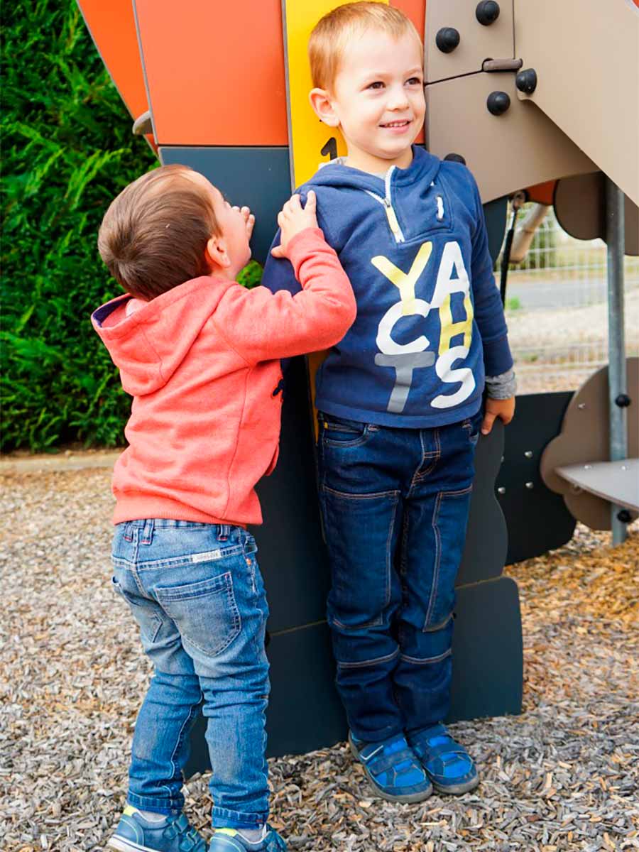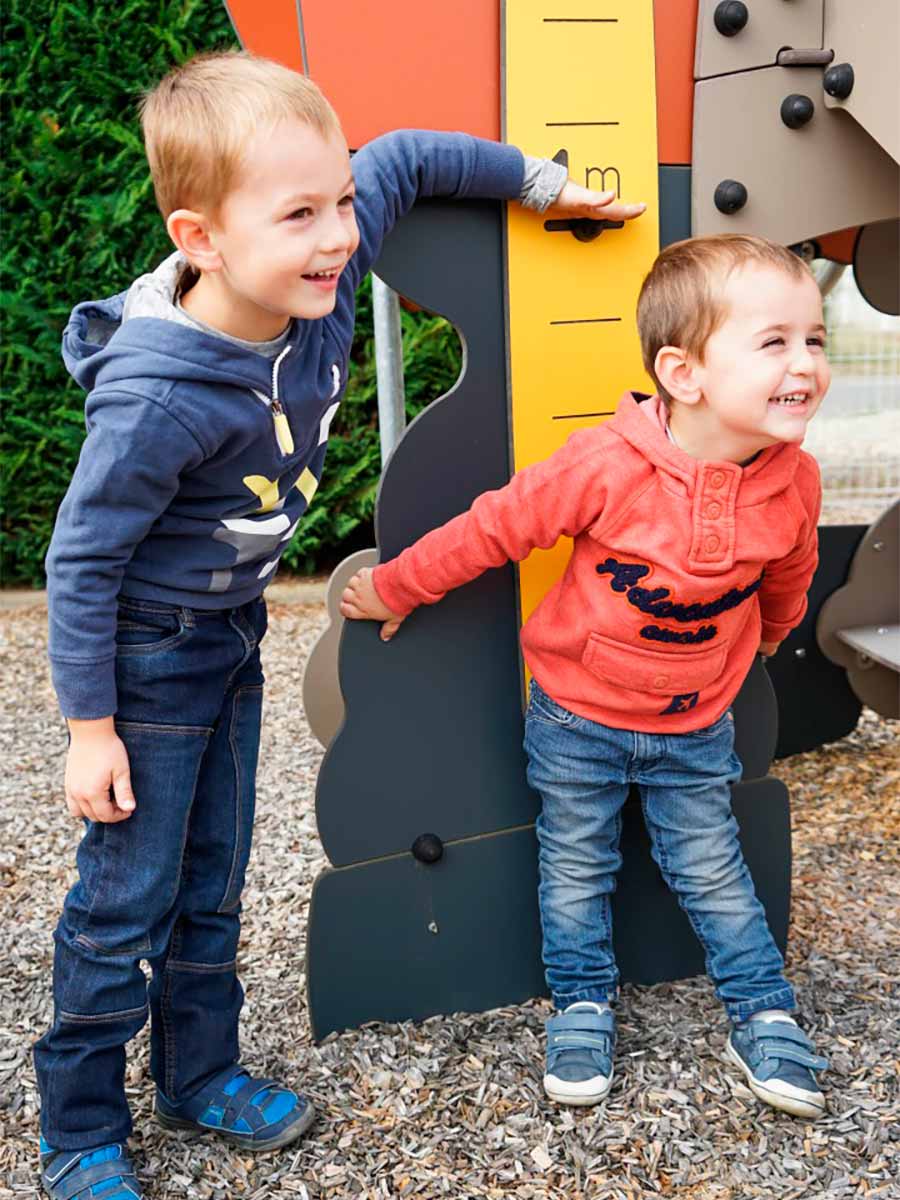 Materiais: Painéis coloridos de HPL com 13 mm de espessura, com excelente resistência a intempéries e vandalismo. As plataformas são feitas de um material compacto texturizado e antiderrapante (HPL), com 12,5 mm de espessura. Um reforço adicional é fornecido por suportes de aço galvanizado, localizados na parte inferior das plataformas. Os degraus, a parede de escalada e o elemento inclinado são feitos de um material compacto antiderrapante (HPL) de 12,5 mm de espessura. Tubos de aço inoxidável, com diâmetro 40mm, garantindo durabilidade a longo prazo e confiabilidade ao equipamento. As fixações de poliamida moldada por injeção conectam os postes às plataformas e aos vários acessórios de jogo. As fixações são não tóxicas, não inflamáveis, resistentes a choques e a radiação ultravioleta. Elas conferem, ao equipamento, robustez e protecção contra o vandalismo. As cordas de 16 mm de diâmetro são feitas de cabo de aço galvanizado coberto com poliéster. Os cabos são interligados e mantidos no lugar por esferas de poliamida injetadas. A superfície deslizante do escorrega é feita de aço inoxidável com 2 mm de espessura, modelada, dobrada e enrolada em uma peça. As esferas do ábaco são feitas de cloreto de polivinil macio rotomoldado. As peças plásticas são feitas de poliamida injetada. Presas de escalada de polipropileno, não-tóxicas, não inflamáveis e resistentes a choques e à radiação UV. Fixações de aço inoxidável, protegidas por tampas antivandalismo em poliamida.