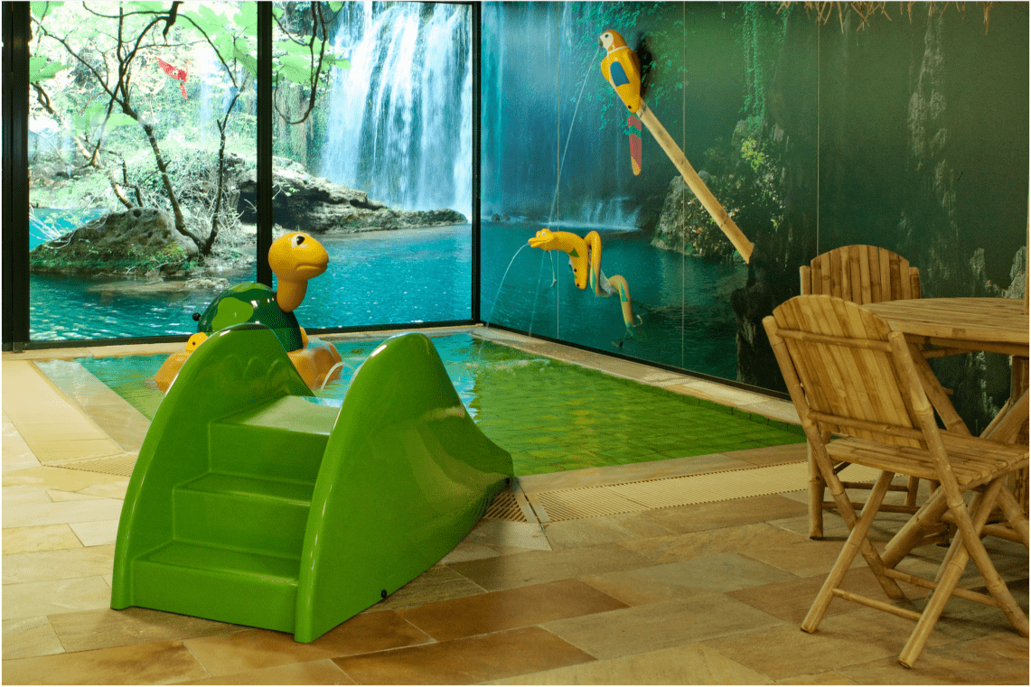 Escorrega para parque aquático e/ou para colocar na entrada de piscinas de criança com profundidade máxima de 220mm. Com a forma de uma onda, a subida é feita por umas escadas nas costas da onda, as quais dão acesso a uma plataforma, com saída escorregando a onda. Equipamento fabricado na Europa, de acordo com as Normas Europeias EN 1069, 1176, 13451 e 17232, e certificado pela TUV.