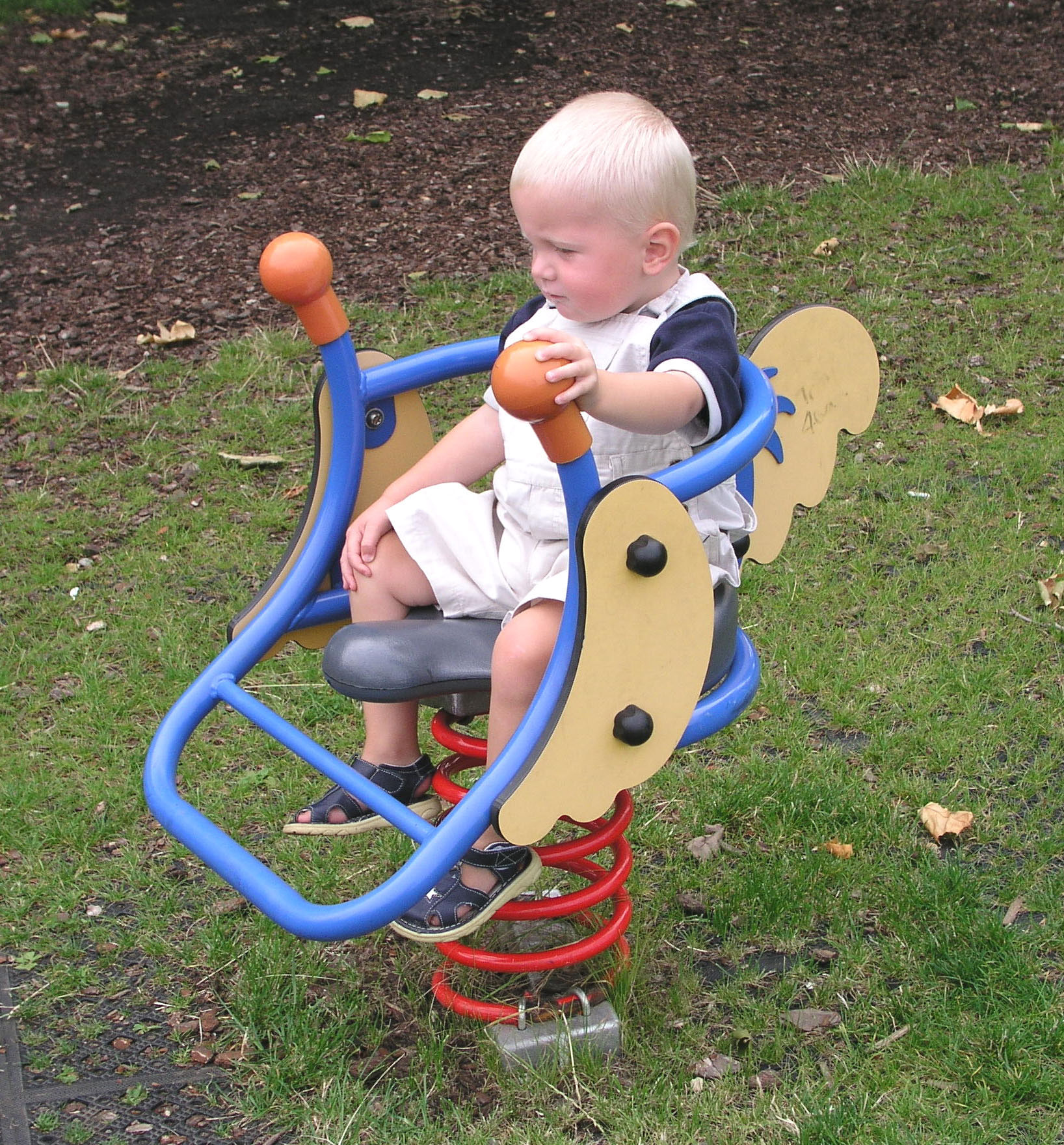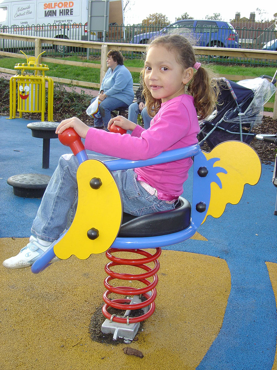 Boneco de mola inclusivo, com estrutura de apoio nas costas e laterais, assim como de mãos e de pés, e com painéis decorativos a imitar asas e cauda de papagaio. Este equipamento tem acesso frontal facilitado, permitindo às crianças entrar e sair do assento sem ajuda e um ótimo apoio enquanto balançam. Para fixação em fundação de betão com 600x600x350mm.
