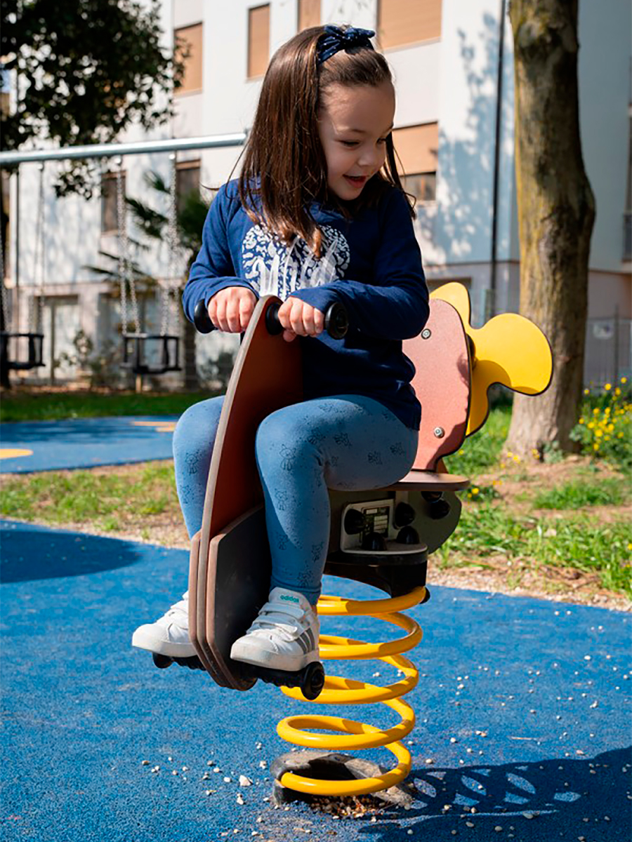 Equipamento oscilante de mola que combina o prazer do movimento com benefícios evidentes para o desenvolvimento motor, sensorial e cognitivo. A oscilação suave e controlada estimula o sistema vestibular, ajudando na perceção do equilíbrio, na coordenação e na orientação espacial, enquanto a ação de segurar, empurrar e equilibrar o corpo sobre a mola reforça o estímulo proprioceptivo, promovendo a consciência corporal e o fortalecimento muscular. O jogo ativo é complementado pelo aspeto lúdico e pela vertente inclusiva física, sensorial e cognitiva, incentivando a socialização e a participação de diferentes perfis de utilizadores.