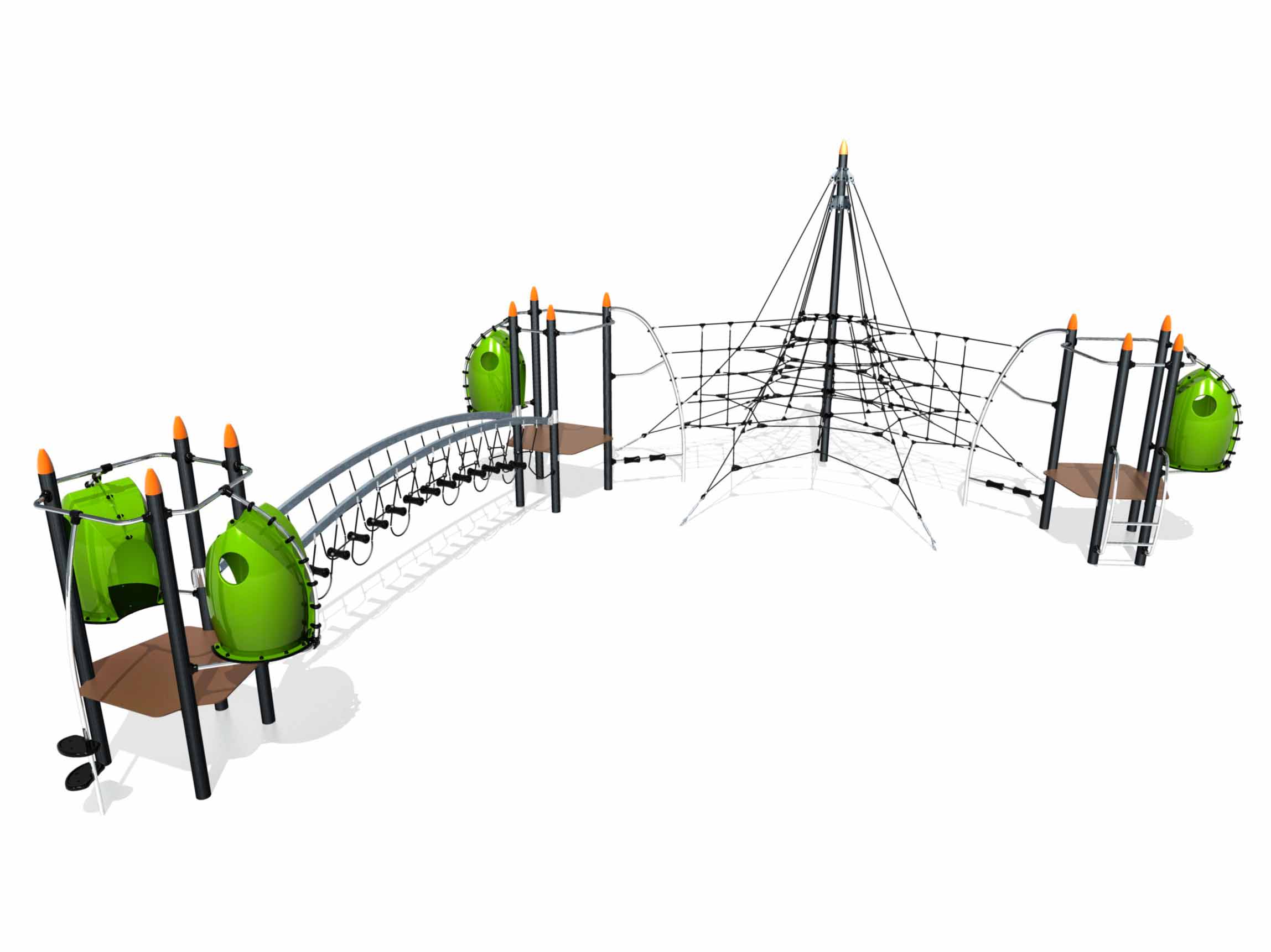 Equipamento multifunções composto por 1 torre com 4 postes e plataforma a 0,91m de altura, com acesso por degraus feitos de borracha e com 2 casulos a 1,3m de altura, ligada por uma ponte arqueada com apoios oscilantes para os pés a 1 torre com 4 postes, plataforma a 0,91 de altura e 1 casulo a 1,3m de altura, ligada por 2 passagens laterais com apoios para os pés, 1 rede vertical para trepar e 1 pirâmide em rede para trepar a 1 torre com plataforma a 0,91m de altura, com 4 postes, 1 casulo a 1,3m de altura, e acesso à plataforma por 1 escada vertical metálica. Ideal para socializar, equilibrar, descansar, esconder, baloiçar, atravessar e trepar.