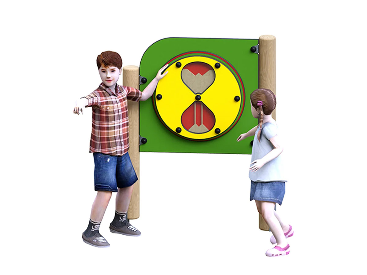 Painel lúdico inclusivo, composto por dois postes estruturais e um painel circular rotativo com ampulheta integrada, concebido para introduzir a noção de tempo de forma visual, concreta e intuitiva. Através da rotação do painel, a ampulheta é acionada, permitindo marcar o tempo para uma atividade, desafio ou jogo no parque, incentivando as crianças a testar se conseguem concluir determinada tarefa dentro do período estipulado. Este equipamento promove a autorregulação, a concentração, o espírito de desafio e a gestão do tempo, estimulando simultaneamente o desenvolvimento cognitivo, a coordenação motora e a socialização. Pode ser utilizado de forma individual ou como elemento complementar a outros equipamentos, enriquecendo a dinâmica lúdica do espaço.