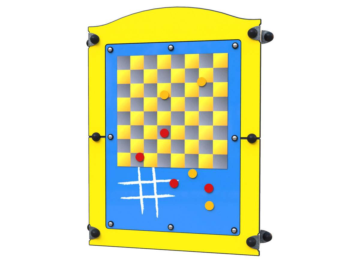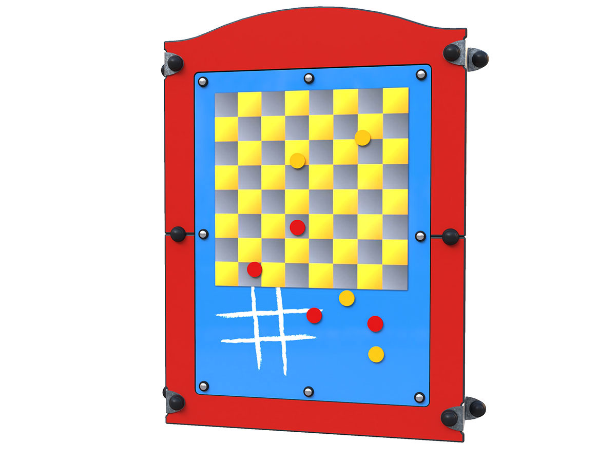Painel lúdico de fixação mural, equipado com quadro magnético para jogos clássicos como damas e jogo do galo, incluindo peões magnéticos que garantem estabilidade durante a utilização. Concebido para promover o raciocínio lógico, o pensamento estratégico, a concentração e o respeito por regras, este equipamento incentiva simultaneamente a socialização e o jogo cooperativo. A solução mural permite otimizar o espaço disponível, sendo especialmente indicada para recreios escolares, zonas cobertas, paredes de edifícios ou áreas de circulação onde não se pretende ocupar área útil de pavimento. O painel estrutural apresenta acabamento na cor vermelha ou amarela, conferindo identidade visual forte e integração dinâmica em diferentes conceitos de parque ou espaço educativo.