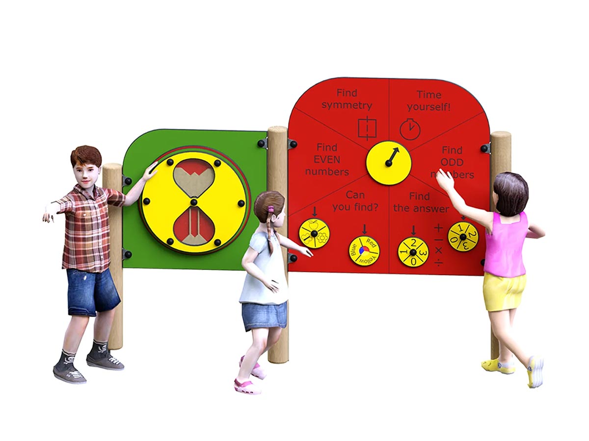 Painel lúdico inclusivo composto por três postes estruturais e dois módulos interativos complementares, concebido para promover o raciocínio lógico, a agilidade mental e o trabalho colaborativo em contexto escolar ou recreativo. O primeiro módulo integra diversos desafios pedagógicos, como “Descobre números pares”, “Descobre simetrias”, “Descobre a resposta” e “Consegues encontrar?”, incluindo 5 círculos giratórios com exercícios relacionados com cálculo matemático, identificação de elementos da natureza, reconhecimento de cores e padrões. O segundo módulo é constituído por um painel circular rotativo com ampulheta integrada, permitindo cronometrar as atividades e introduzir a noção de tempo como fator adicional de desafio. Esta combinação transforma o equipamento numa estação dinâmica de aprendizagem ativa, incentivando o pensamento crítico, a cooperação entre pares, a gestão do tempo e a socialização.