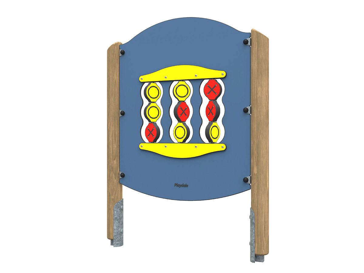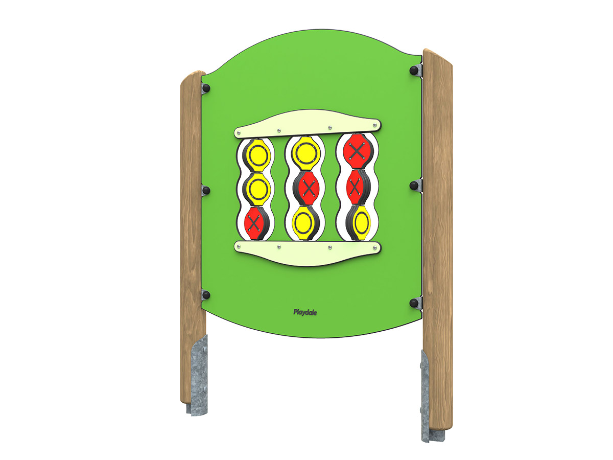 Painel lúdico autónomo, composto por dois postes estruturais em madeira e por um painel central com jogo do galo integrado, concebido para estimular a interação social, o raciocínio lógico e o desenvolvimento cognitivo desde a primeira infância. O elemento central é formado por 9 cilindros rotativos, com símbolos “X” e “O” impressos em faces opostas, permitindo a alternância através de um movimento simples, intuitivo e seguro. Este sistema favorece a coordenação óculo-manual, a motricidade fina, a tomada de decisão e o pensamento estratégico, incentivando o jogo a dois, a aprendizagem cooperativa e a compreensão de regras básicas. De linguagem formal simples e contemporânea, com acabamento em tom verde, integra-se harmoniosamente em parques infantis, recreios escolares ou espaços exteriores de lazer.