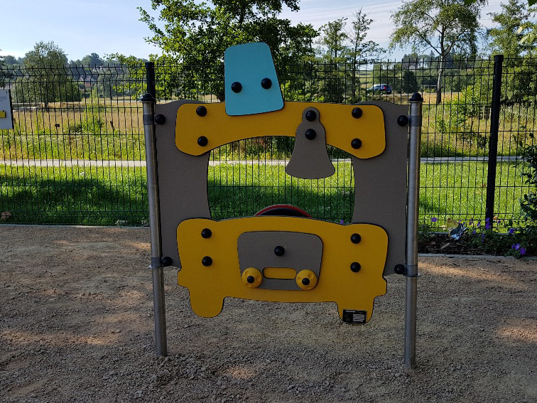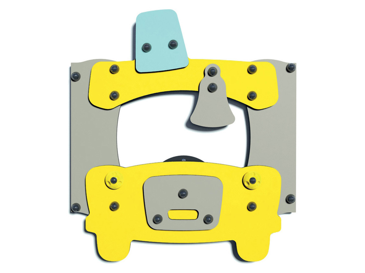 Painel de jogos compreendendo um painel colorido com uma ambulância, com janela para espreitar e um volante do lado interior. Ideal para brincar ao “faz de conta”, manusear, estímulo visual e sensorial.