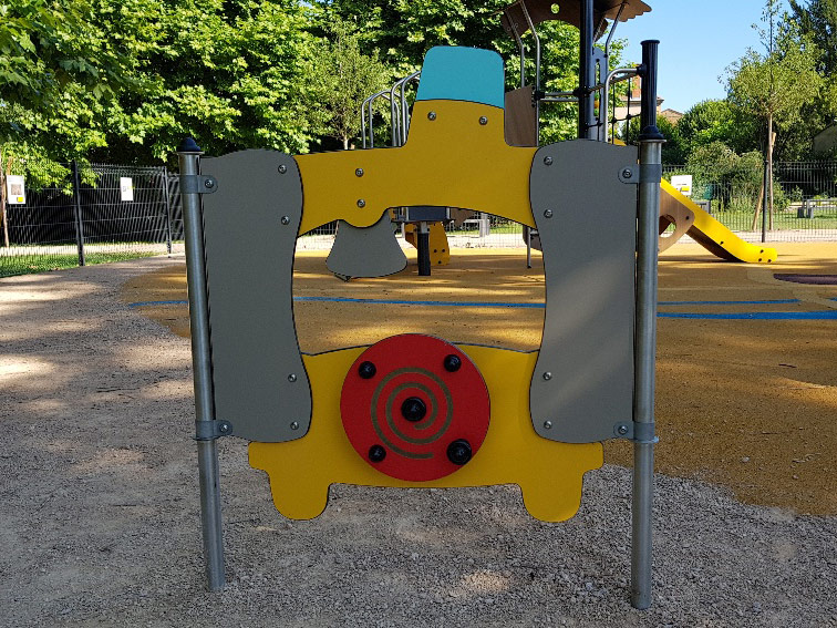 Materiais: Os painéis coloridos são feitos de um material compacto de 13 mm de espessura (HPL), de construção robusta, oferecem excelente resistência a intempéries e vandalismo. A vigia é feita de termoplástico resistente a não estilhaçar (PMMA). As peças de plásticas são feitas de poliamida injetada. Fixações de aço inoxidável, protegidas por tampas antivandalismo em poliamida.