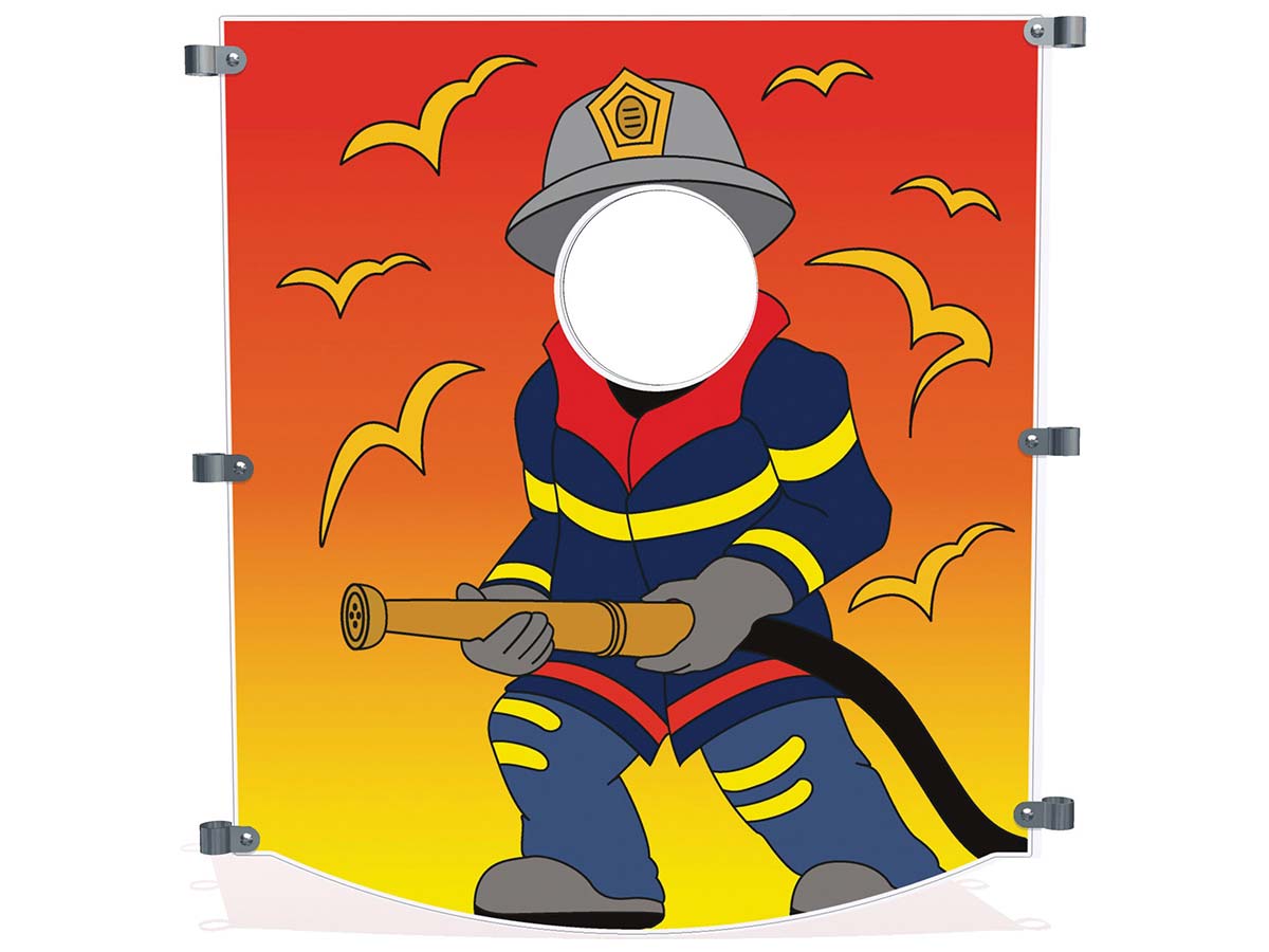 Painel de jogos compreendendo uma impressão com a imagem de um bombeiro, com um buraco na cara, para brincar ao faz de conta e tirar fotografias.