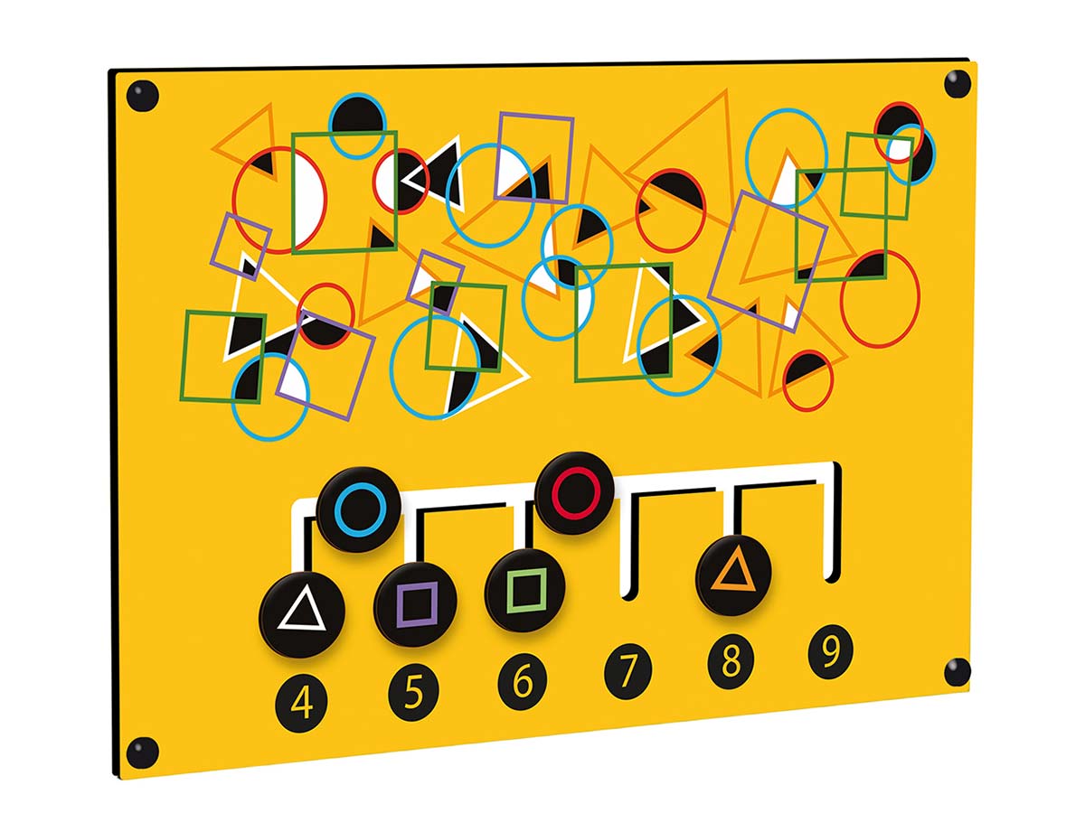 Painel de jogos compreendendo um jogo com ilustrações de formas geométricas de várias cores e números para contagem, com 6 discos para fazer as correspondências. Para jogar, manusear e estímulo cognitivo.