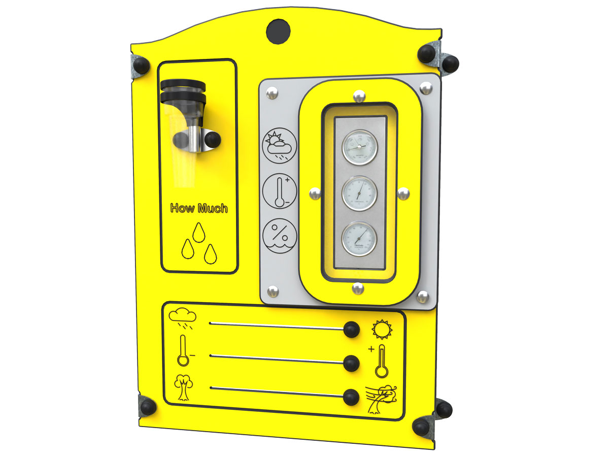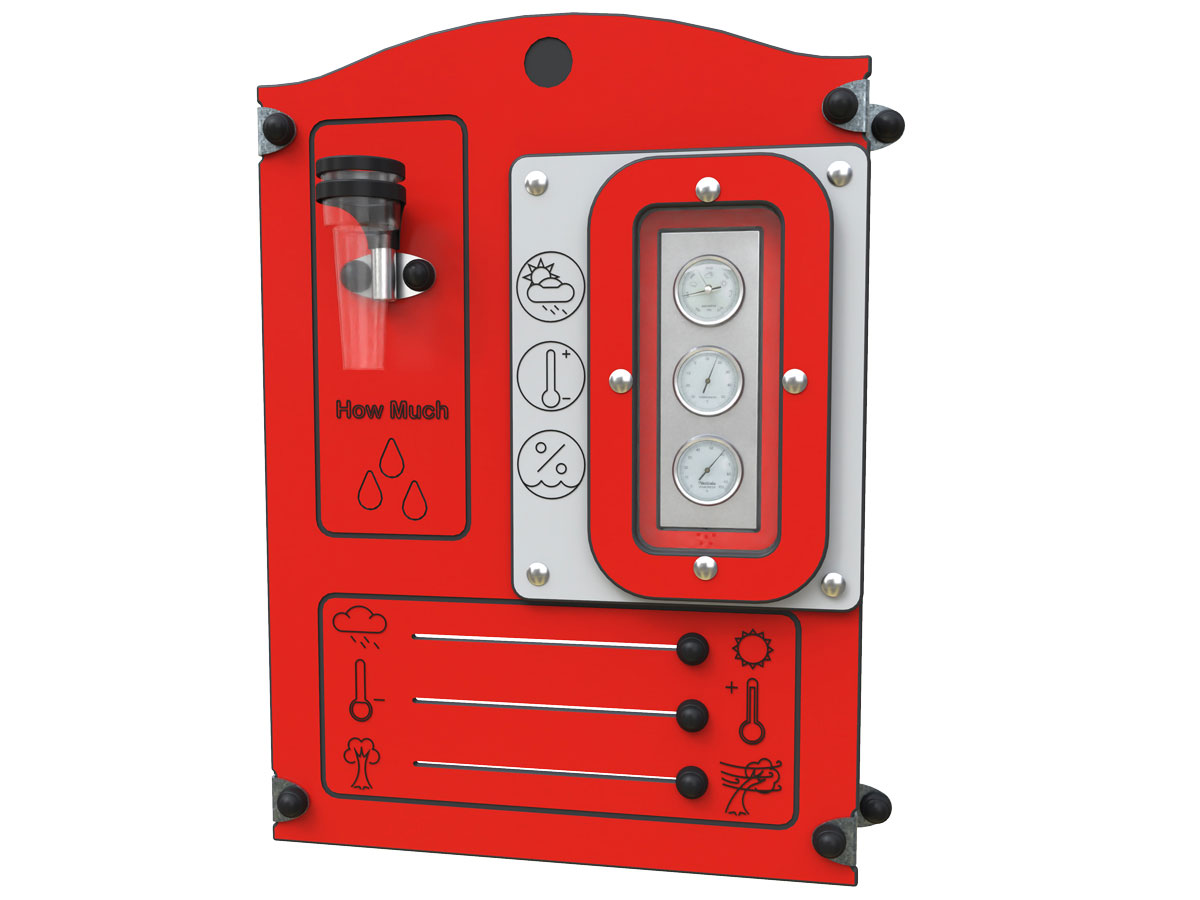 Painel lúdico pedagógico de fixação mural, concebido para estimular a curiosidade científica e a aprendizagem sobre fenómenos atmosféricos. Esta versão apresenta painel estrutural na cor vermelha ou amarela, conferindo forte identidade visual e integração dinâmica em espaços escolares ou recreativos. O equipamento integra uma estação meteorológica composta por barómetro, termómetro, higrómetro e pluviómetro, permitindo às crianças observar, comparar e interpretar variações climáticas de forma prática e interativa. Promove o pensamento científico, a capacidade de observação, a interpretação de dados e o contacto com conceitos básicos de climatologia. A fixação direta à parede permite otimizar o espaço disponível, sendo especialmente indicada para recreios escolares, zonas cobertas ou fachadas de edifícios.