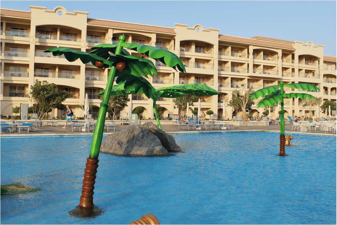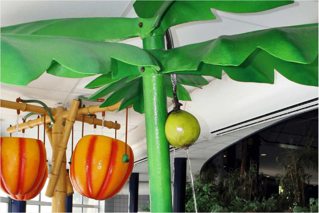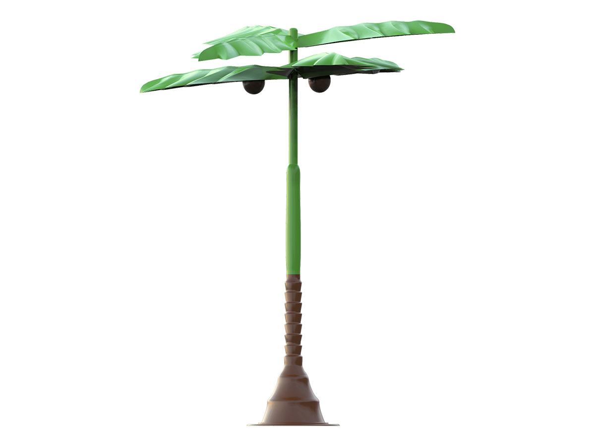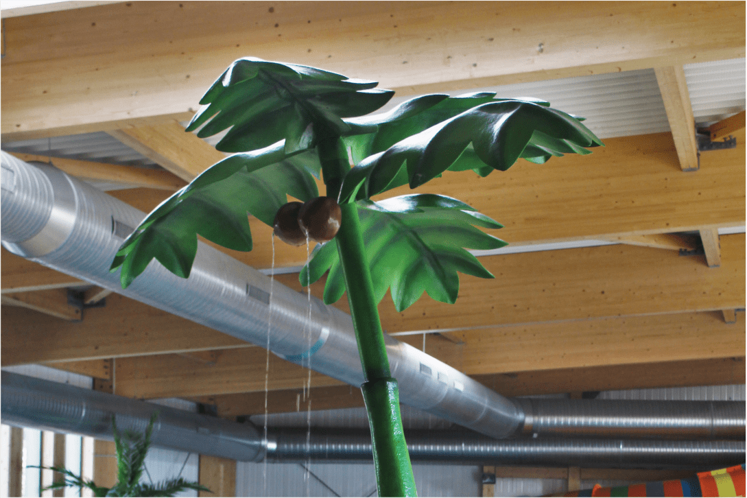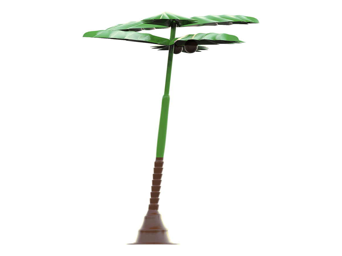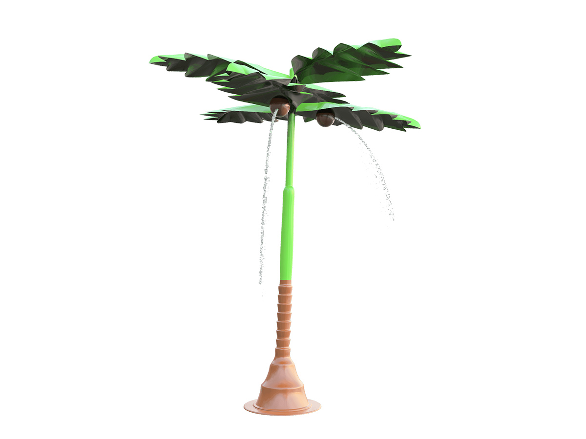 Equipamento aquático para spray park ou para colocar em piscina de criança com profundidade máxima de 500mm. Composto por um poste em forma de tronco, folhas de palmeira no topo e cocos de onde sai a água. Equipamento fabricado na Europa, de acordo com as Normas Europeias EN 1069, 1176, 13451 e 17232, certificado pela TUV.