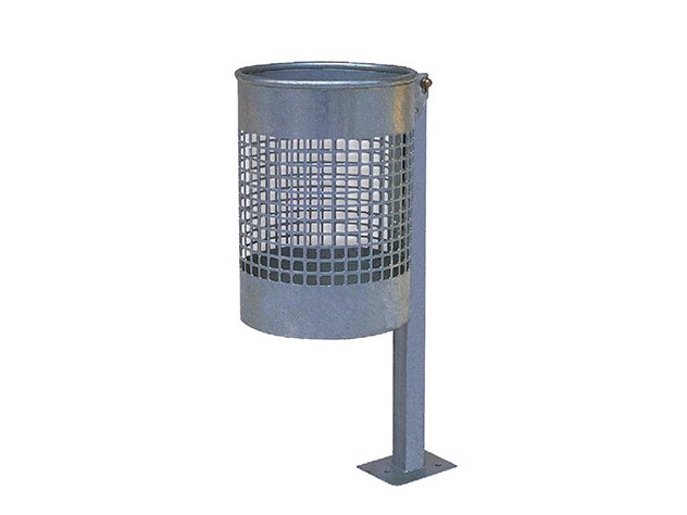 Papeleira metálica circular com 348mm de diâmetro fixa a 1 poste. Capacidade para 46 litros. Para fixação de superfície.