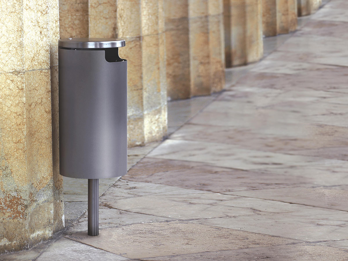 Caixote do lixo com capacidade de 55Lt. Composto por uma estrutura cilíndrica de aço, com abertura basculante com fecho de encaixe, poste para fixação e equipada com orifício frontal para a introdução de resíduos e argola porta-sacos.