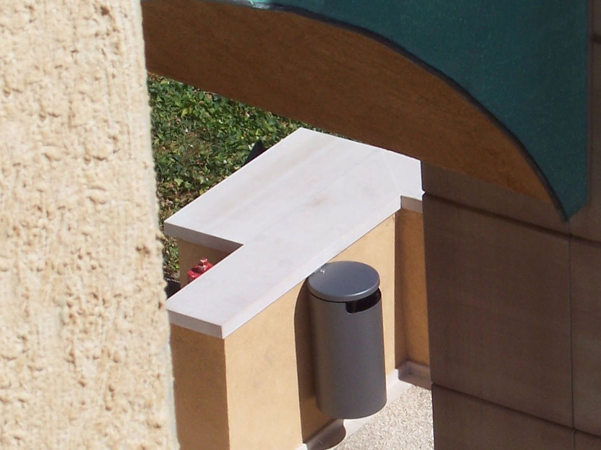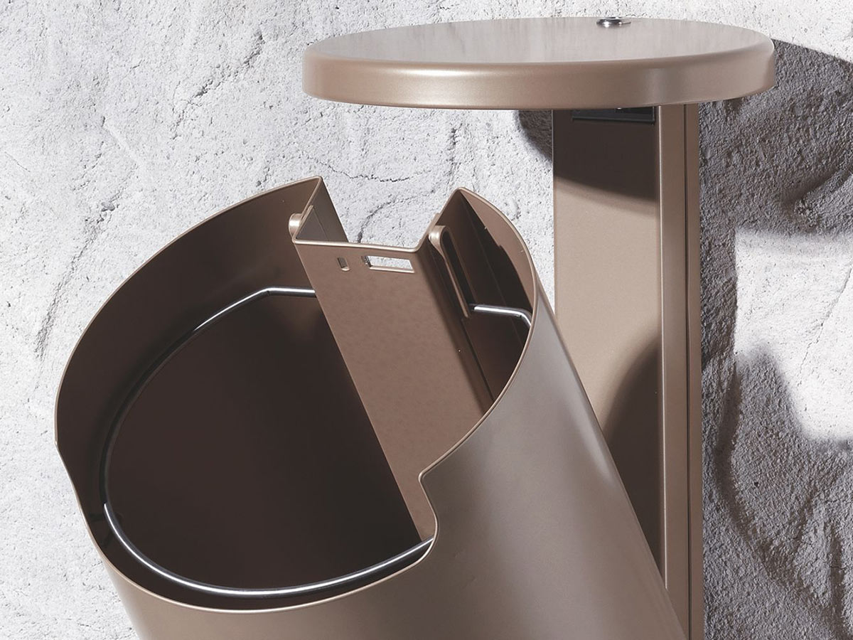 Caixote do lixo com capacidade de 55Lt. Composto por uma estrutura cilíndrica de aço, com abertura basculante com fecho de encaixe e equipada com orifício frontal para a introdução de resíduos e argola porta-sacos.