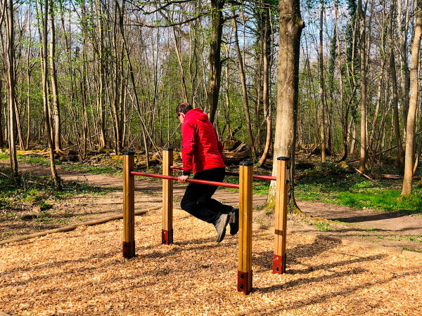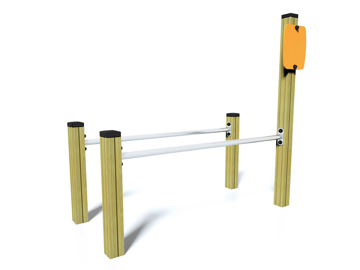 Equipamento de exercício, pararelas junior, composto por 4 postes verticais em madeira laminada, 2 barras em aço, a 0,64m de altura, e 1 painel informativo.