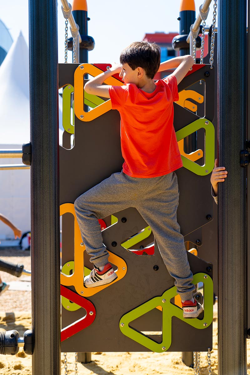 Materiais: Os postes de 125mm de diâmetro são feitos de aço galvanizado pintado. O acabamento granulado tem uma superfície levemente ondulada para maior resistência a arranhões. As tampas são feitas de polietileno moldado rotativamente. Os tubos são feitos de aço inoxidável de 40 mm de diâmetro, garantindo a durabilidade e confiabilidade a longo prazo do equipamento. Fixações de poliamida moldada por injeção conectam os postes com as plataformas e os vários recursos de jogo. São não-tóxicas, à prova de fogo e resistentes aos U.V. A espessura da poliamida torna o equipamento forte e resistente ao vandalismo. Os painéis coloridos são feitos de um material compacto de 13 mm de espessura (HPL). Robusto na construção, possui excelentes propriedades de resistência às intempéries e ao vandalismo. O piso das plataformas/degraus é feito de um material de polietileno antiderrapante de 18 mm de espessura. As correntes são feitas de aço inoxidável. As fixações são feitas de aço inoxidável ou banhado e protegidas por tampas de poliamida antivandalismo.