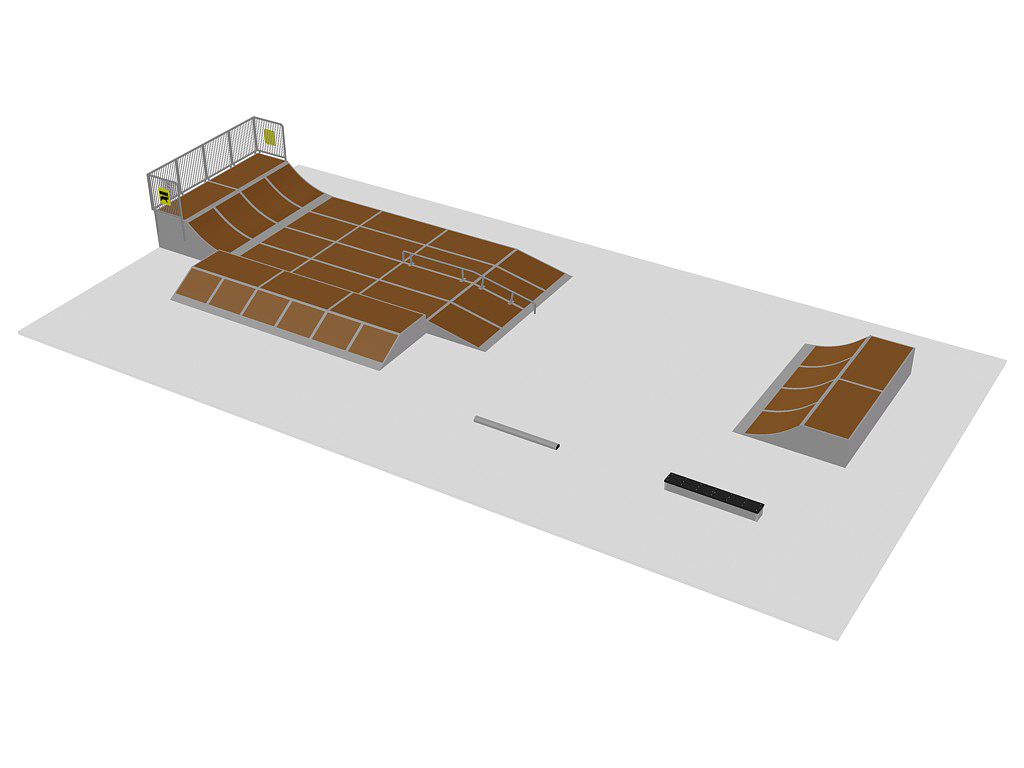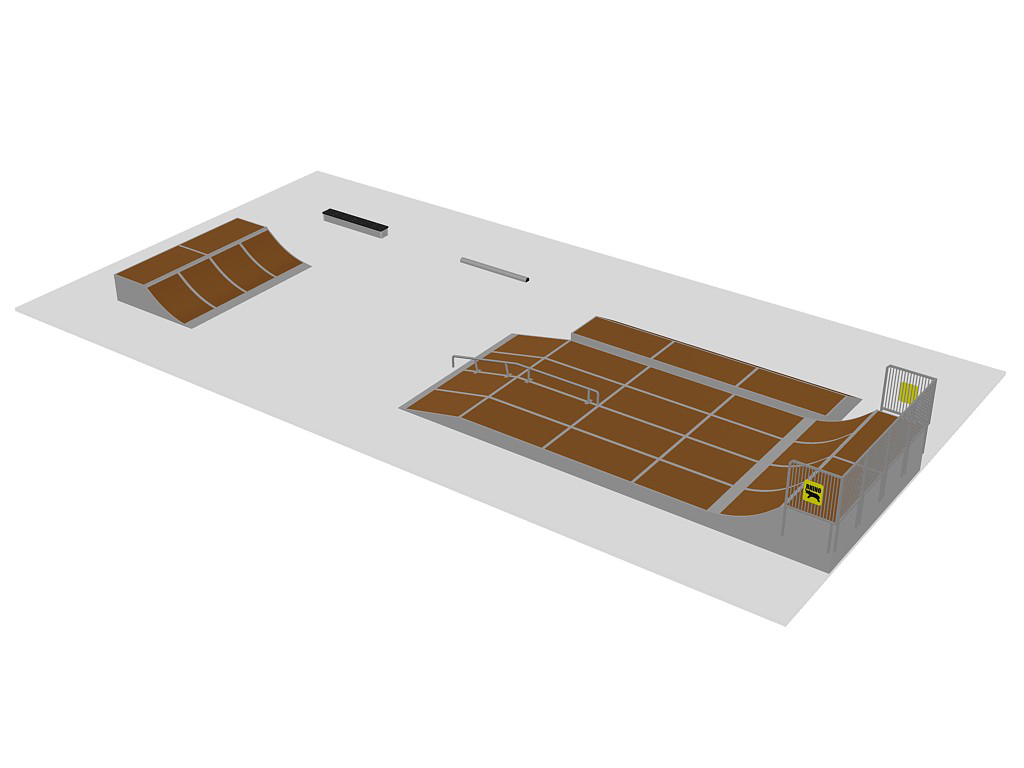 Parque de skates, patins e bicicletas polivalente e modular, projetado com os detalhes e pormenores de engenharia exigidos pelas mais rígidas regras de segurança mundiais. Desenvolvido de forma a oferecer a combinação perfeita de rampas e um bom fluxo, tanto para utilizadores com pouca ou nenhuma experiência, como para utilizadores experientes. Composto pelos seguintes módulos: 1 combinação Funbox com Funbox 0,4M (16x), Flatwedge 0,4M (4x), 2/3 Grindrail, 0,8M Quarterpipe (no topo) e 0,6M Street Bank; 0,8M Quarterpipe; Parking Block; e Street Bench.