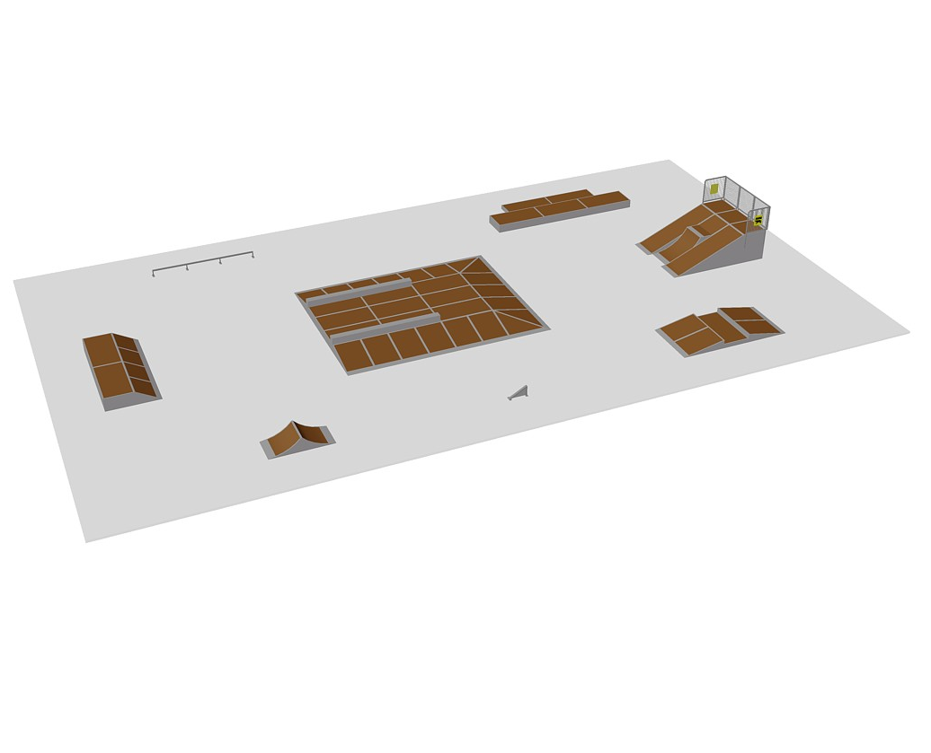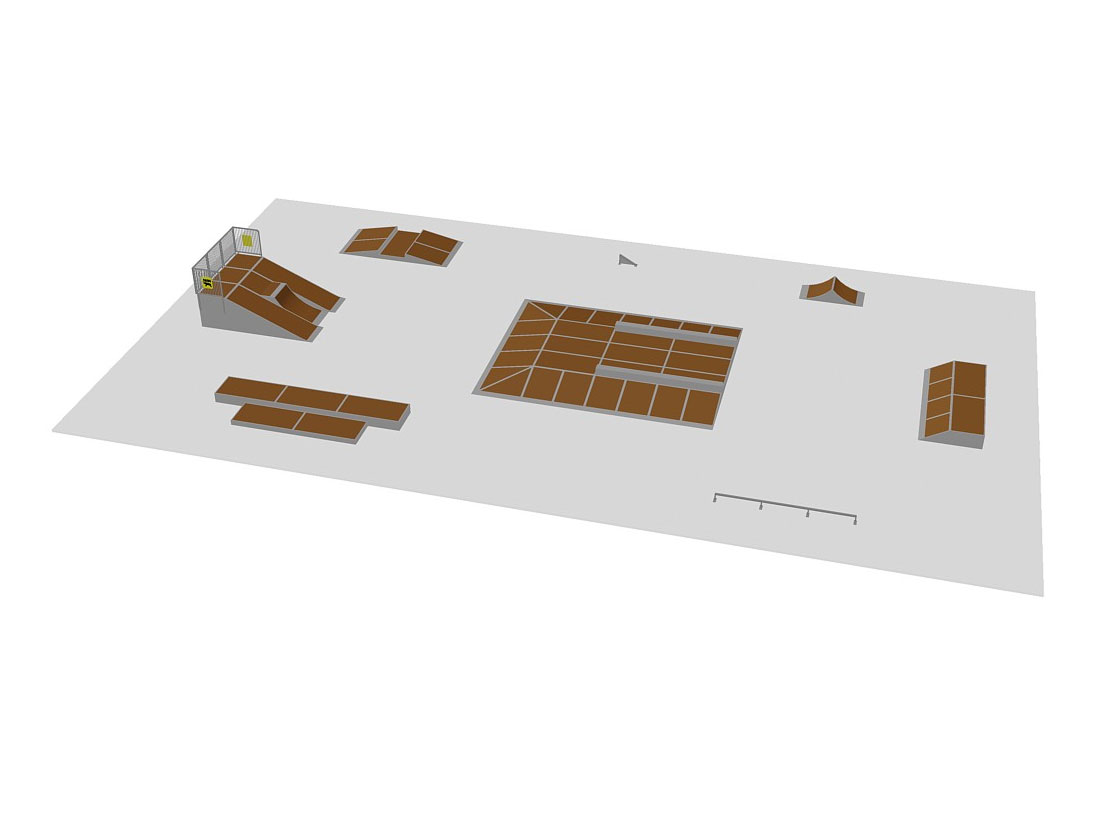 Parque de skates, patins e bicicletas polivalente e modular, projetado com os detalhes e pormenores de engenharia exigidos pelas mais rígidas regras de segurança mundiais. Desenvolvido de forma a oferecer a combinação perfeita de rampas e um bom fluxo, tanto para utilizadores com pouca ou nenhuma experiência, como para utilizadores experientes. Composto pelos seguintes módulos: 1 Flatwedge 0,4M; Minibox 0,2M; Streetspine; 1,5M Flat Bank; 1,5M Kickerramp; 0,6M Streetbank; Manny Combo; Large Grindrail; Pole Jam Grindrail; 1 combinação Funbox com Funbox 0,4M (9x), Flatwedge 0,4M (15x), Pyramid corner 0,4M (2x), e Ledge (4x). As rampas são as mais silenciosas do mercado, com uma superfície de deslizamento rápida, mas suave na queda, de elevada durabilidade, não aquecem, têm secagem rápida, são fáceis de limpar e apresentam uma necessidade de manutenção muito reduzida. Com o seu sistema de modular, poderá ainda desenhar e construir qualquer circuito, adicionando novas peças ou conjugando os seus módulos de forma diferente, de forma a introduzir atualizações e/ou novidades, ao longo do tempo, com muito pouco esforço financeiro.