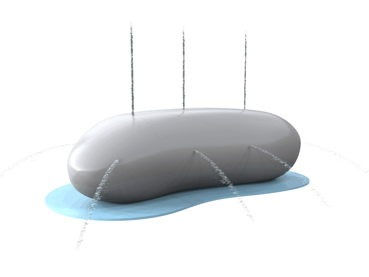 Spray de chão para spray park ou para colocar na entrada de piscinas de criança com profundidade máxima de 300mm. Com a forma de uma pedra da qual saem diversos jatos de água. Equipamento fabricado na Europa, de acordo com as Normas Europeias EN 1069, 1176, 13451 e 17232, certificado pela TUV.