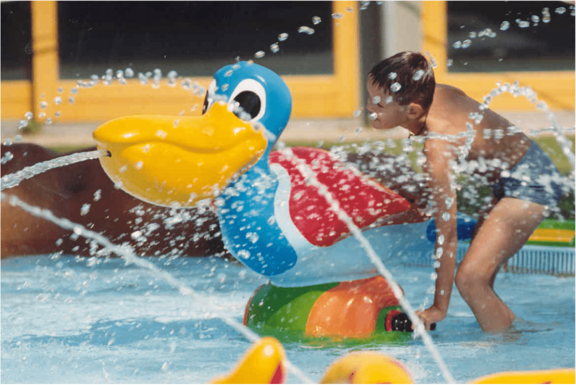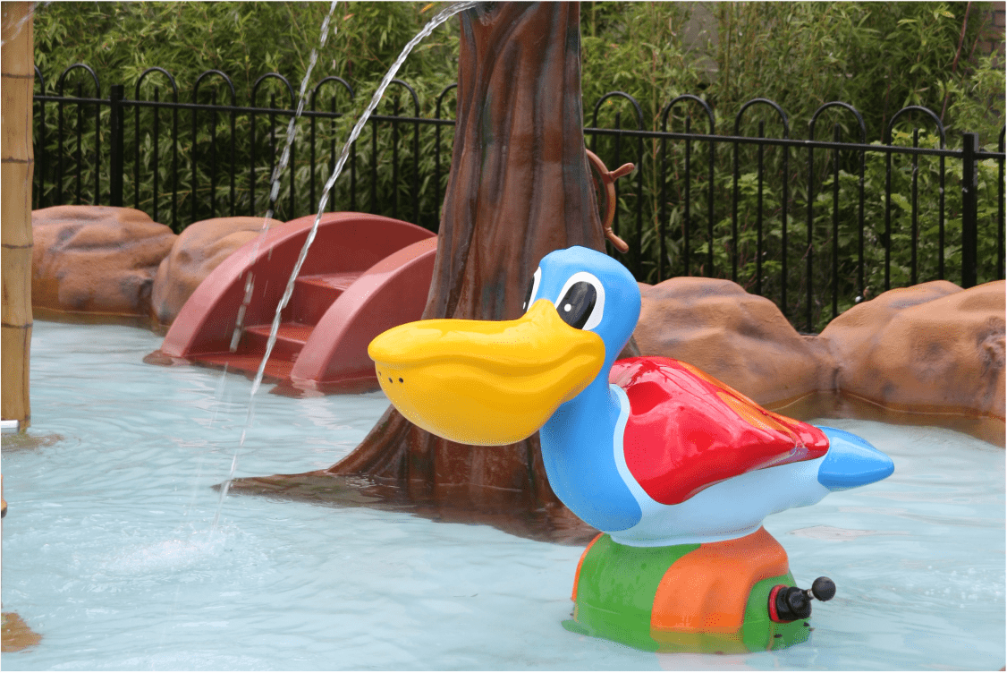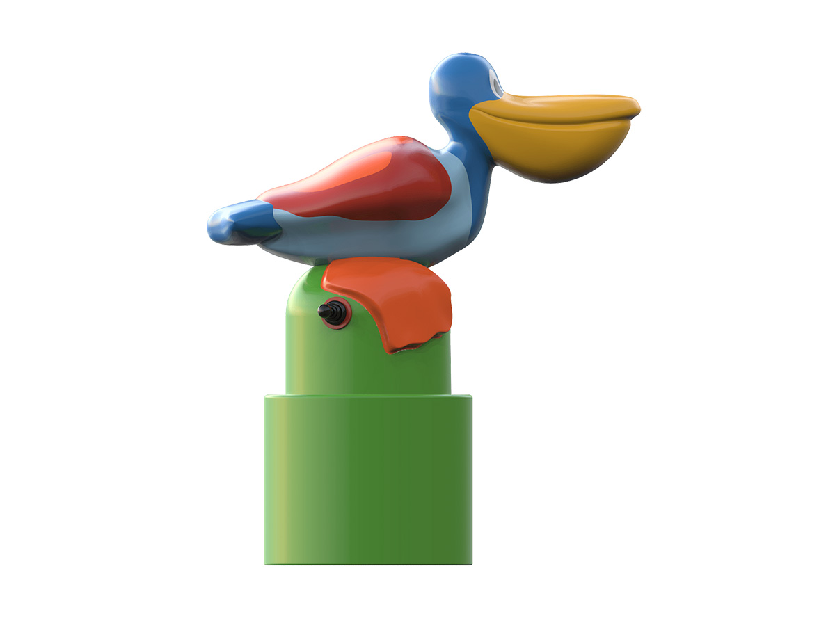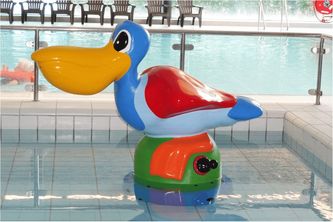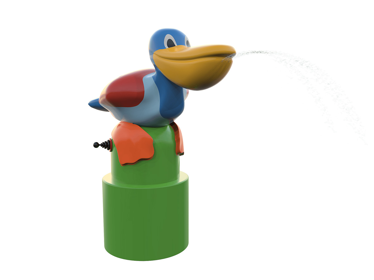 Equipamento aquático para spray park ou para colocar na entrada de piscinas de criança com profundidade mínima de 100mm e máxima de 350mm. Composto por uma figura de um pelicano apoiado numa base com bomba manual. Bombeie o mais rápido possível para acionar um jato de água pela boca do pelicano. Equipamento fabricado na Europa, de acordo com as Normas Europeias EN 1069, 1176, 13451 e 17232, certificado pela TUV.