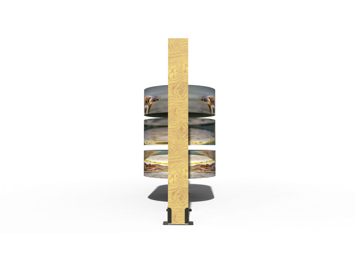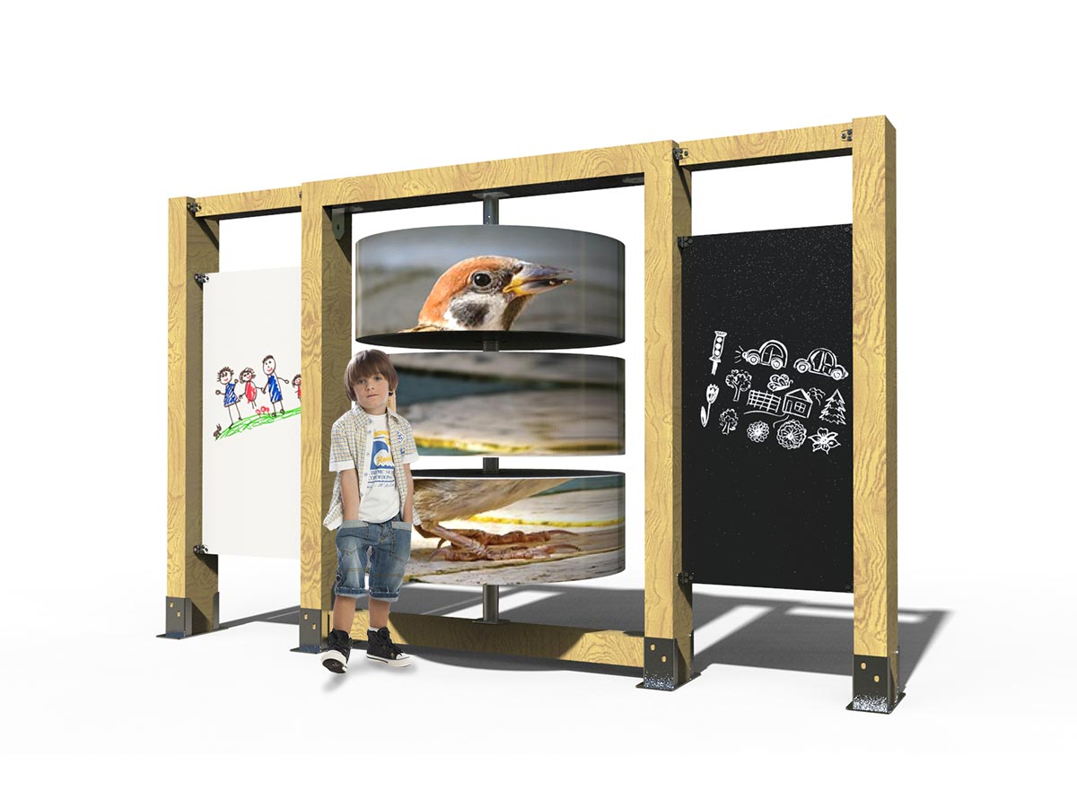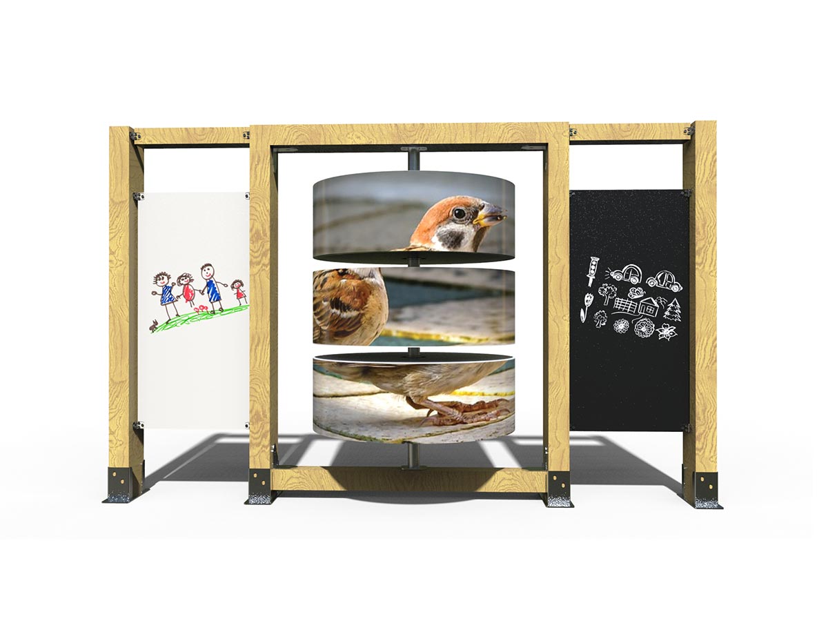 Conjunto de painéis lúdicos e didáticos PLAY IN ART® by PLAY PLANET. Composto por uma estrutura com 4 postes e 4 traves de madeira de robinia, um quadro branco para desenhar, um quadro preto para giz e um módulo de jogo composto por 3 cilindros com 350mm de altura, os quais rodam sobre um tubo de eixo vertical com diâmetro de 60mm e permitem compor uma imagem quando corretamente alinhados. O conteúdo das imagens pode ser personalizado, consoante as necessidades do cliente, de forma a promover a cultura, história e património local. A imagem gráfica pode ser fornecida pelo cliente ou sugerida pela Play Planet. Equipamento ideal para estímulo físico, cognitivo e sensorial, para treino da motricidade e para despertar a consciência ambiental. Fixação de superfície.