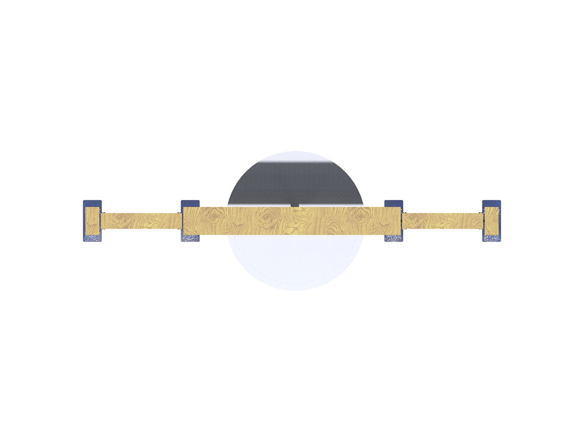 Material: Estrutura composta por postes e traves de madeira de robinia. Elementos de fixação e cilindros de jogo com 350x1000x1000mm em chapa quinada, com tratamento de decapagem, metalização e pintura (RAL a definir). Vinil monomérico com laminação e corte especial. Ferragens em inox.
