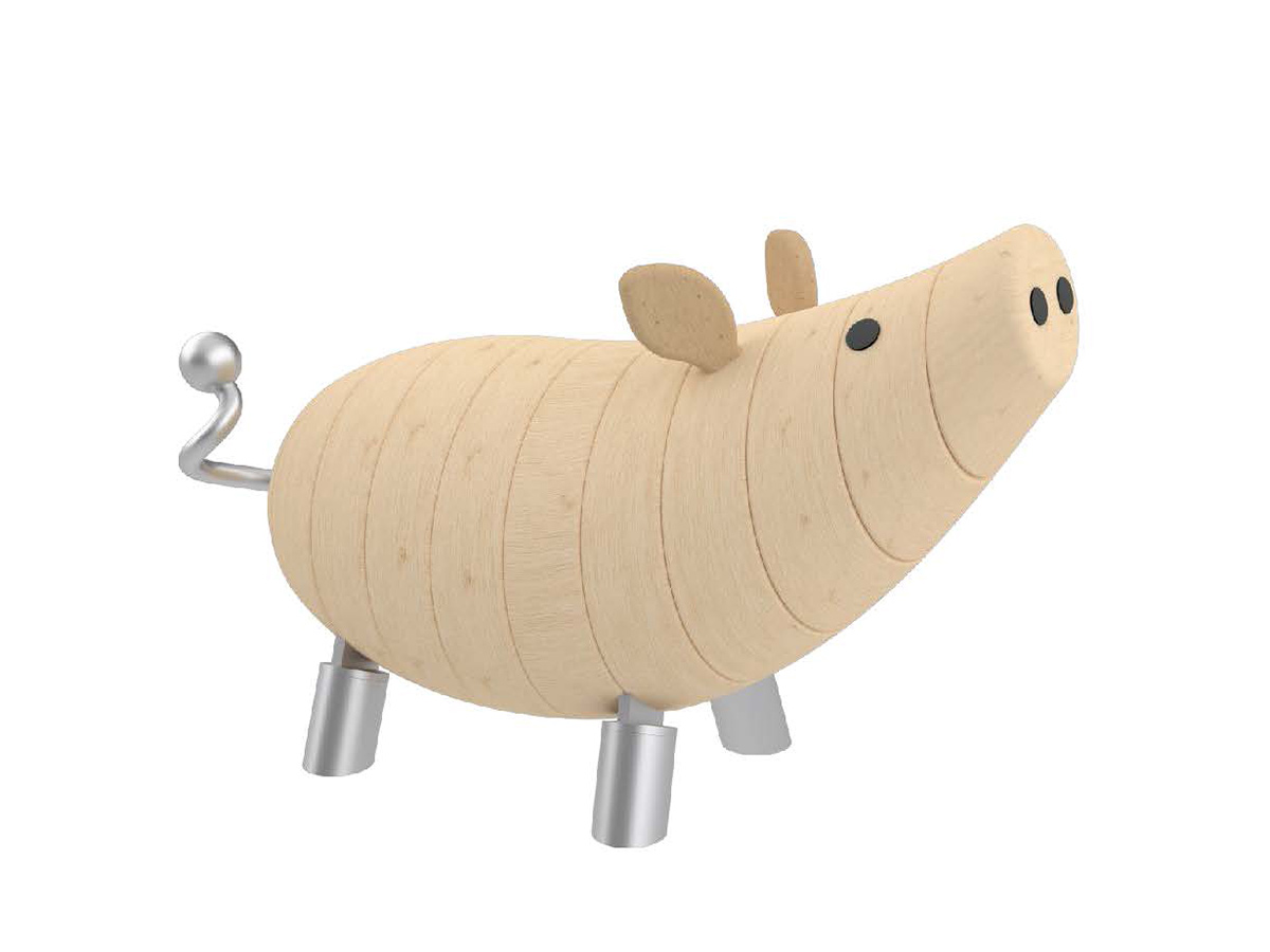Materiais: Corpo do animal em madeira laminada de lariço, disponível em acabamento natural ou em versão colorida, com as seguintes opções: