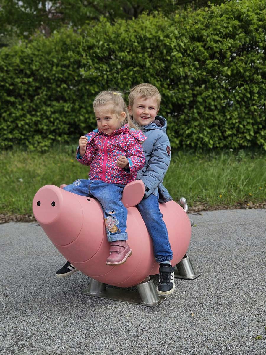 Elemento lúdico tridimensional em madeira, concebido para trepar, equilibrar e estimular jogos de imaginação, com a forma estilizada de um porco. Este equipamento incentiva o desenvolvimento da coordenação motora, do equilíbrio e da consciência corporal, promovendo simultaneamente o jogo simbólico e a interação social entre crianças. A estrutura é composta por quatro patas em aço inoxidável que garantem elevada estabilidade e resistência, corpo formado por travessas robustas em madeira laminada e cauda curva rotativa em aço inox, que acrescenta um elemento dinâmico e sensorial ao equipamento. A sua dimensão e altura tornam-no adequado para utilização em parques infantis e espaços exteriores de recreio. Preparado para fixação em sapatas de betão, assegurando estabilidade e durabilidade em utilização intensiva.