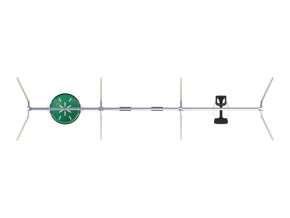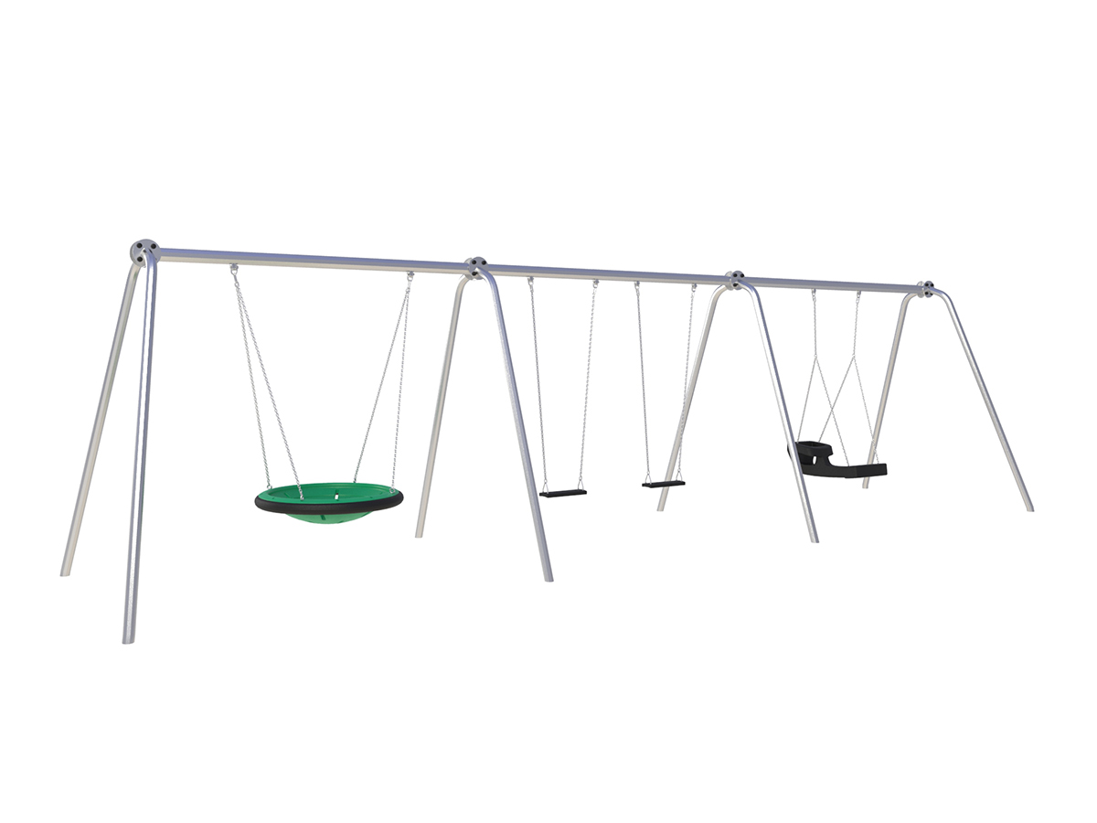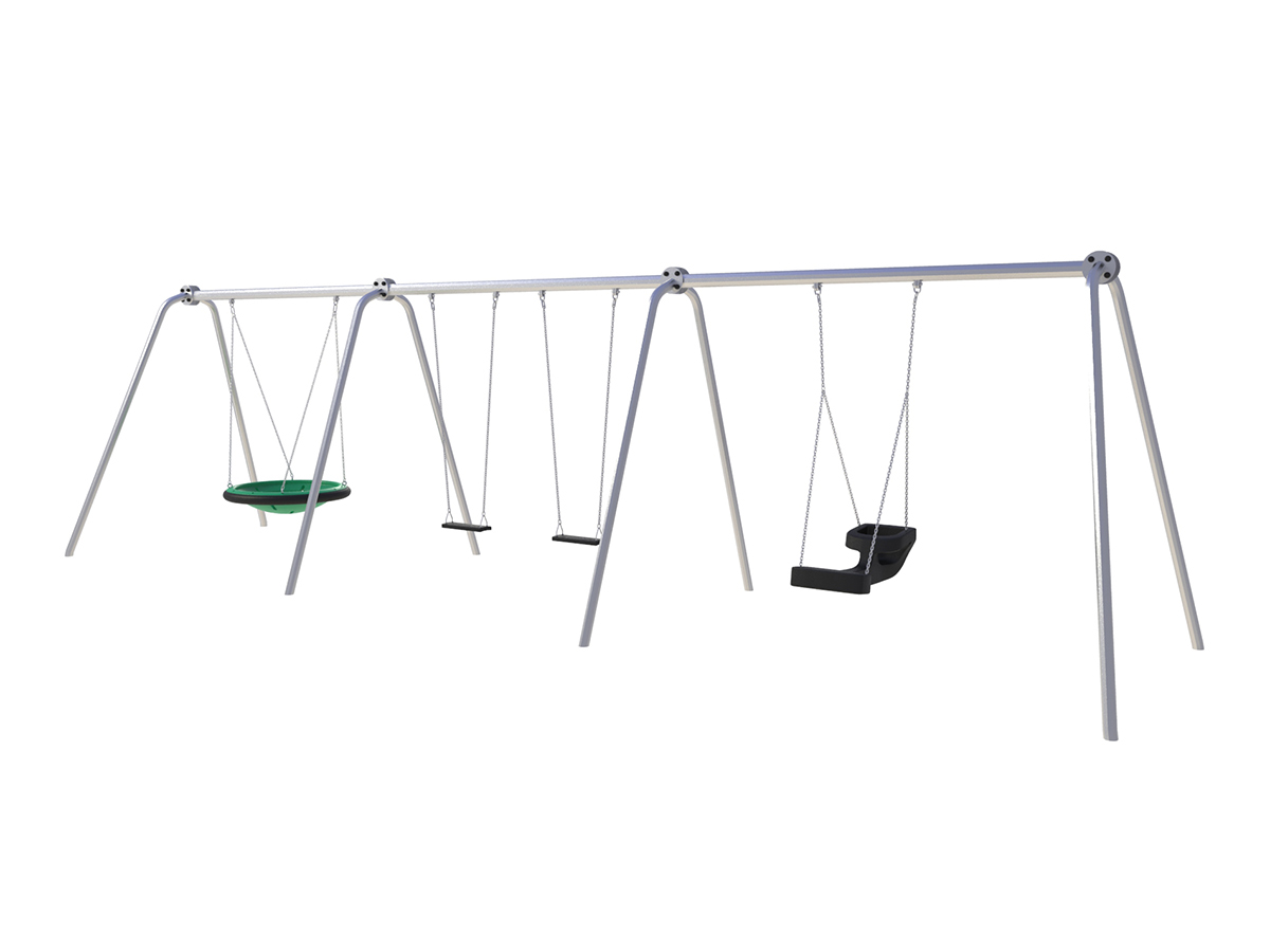 Pórtico de baloiço inclusivo de grande capacidade elevada resistência, especialmente concebida para promover o convívio intergeracional e o jogo partilhado. Apresenta uma configuração robusta, composta por quatro conjuntos de postes metálicos dispostos em forma de “A”, unidos por uma viga horizontal contínua em aço inoxidável, o que confere à estrutura uma estética urbana, moderna e uma excelente estabilidade. Este equipamento foi pensado para permitir a utilização simultânea por várias pessoas de diferentes idades ou capacidades, criando oportunidades únicas de interação entre crianças, pais, avós e irmãos. Estimula o equilíbrio, a coordenação motora e a perceção corporal, contribuindo para o desenvolvimento físico e social dos utilizadores. Inclui uma ampla variedade de assentos adaptáveis às necessidades de cada espaço e público-alvo: um assento inclusivo em forma de ninho de pássaro (modelos SEAT 7 ou SEAT 8), dois assentos planos (SEAT 1/AW), e um assento familiar “cara-a-cara” (SEAT 4/AW), todos compatíveis com sistema de segurança “anti-wrap”, que evita o enrolamento das correntes na viga. A instalação é feita por fixação direta em sapatas de betão com 85 cm de profundidade. Todo o conjunto cumpre rigorosamente os requisitos da norma europeia EN 1176 e a legislação nacional aplicável à segurança em espaços de jogo e recreio, garantindo uma utilização segura e acessível para todos.