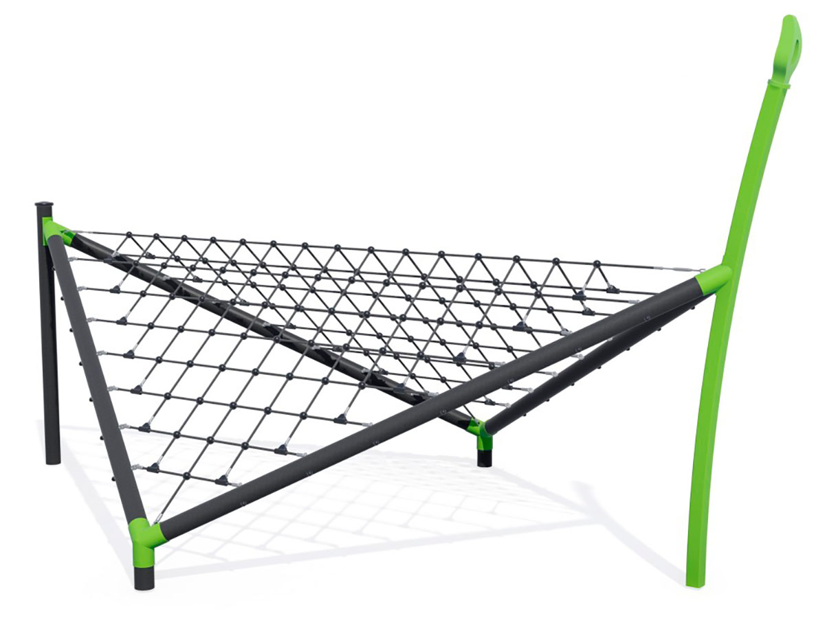 Rede de atividades composta por 1 rede fixa por 4 postes em aço, um deles com decoração Kanopé, presa numa moldura composta por 4 postes em madeira e estendida em forma de telhado. Ideal para trepar, socializar, atravessar e estímulo cognitivo.