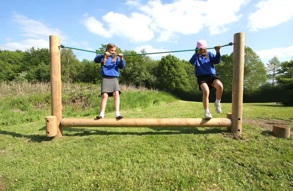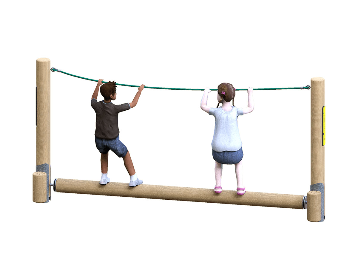 Equipamento para treino do equilíbrio, coordenação motora, agilidade e superação de obstáculos. Composto por 2 postes verticais unidos por uma trave redonda rotativa, colocada a 24cm de altura do solo, e uma corda para apoio de mãos, fixa no topo.