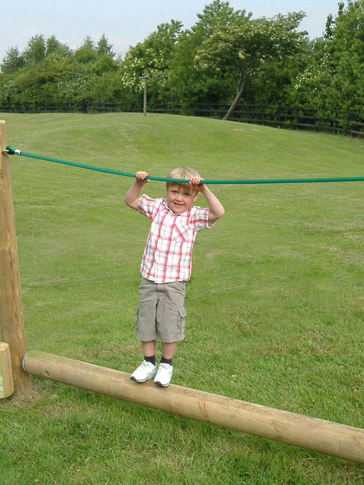 Materiais: Postes de madeira laminada de alta qualidade, redondos, de pinho de crescimento extremamente lento, retirado de florestas totalmente sustentáveis com acreditação FSC ou PEFC, com secções produzidas de acordo com a norma EN 386: 2001, bordas salientes acabadas com um raio maquinado para conferir um acabamento suave e sem lascas de acordo com a EN 1176, e sujeitos a tratamento a alta pressão de acordo com as EN 351-1 e EN 335-2, isento de crómio e arsénio. Corda com núcleo de aço resistente ao vandalismo; os pontos terminais são de aço hidraulicamente pressionado ou de ponteiras de alumínio com parafusos de aço inox (A2).