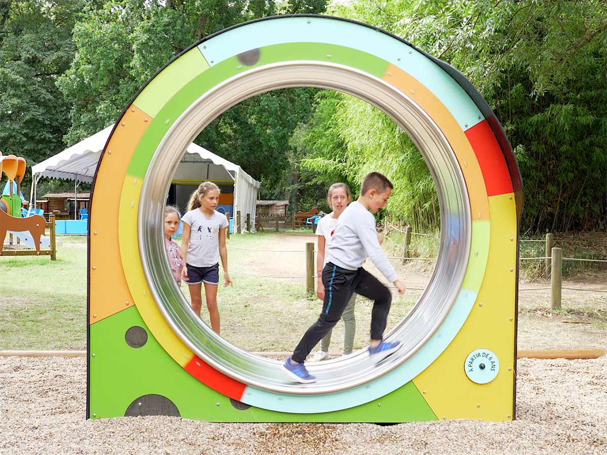 Equipamento dinâmico, inspirado numa roda gigante de hamsters, para fazer girar sem perder o equilíbrio, a andar ou a correr. Composto por uma grande estrutura metálica colorida com uma abertura circular rotativa, para permitir o uso também de pé. Ideal para socializar, equilibrar, rodar, estimulação sensorial e cognitiva. Para fixação de superfície.