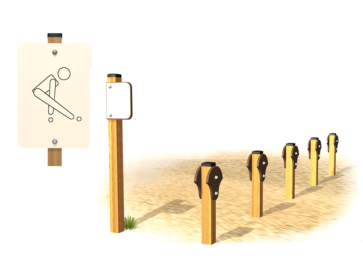 Equipamento de exercício para salto ao eixo júnior, composto por 6 postes verticais em madeira laminada (5 para salto e 1 para sinalética) e 1 painel informativo.