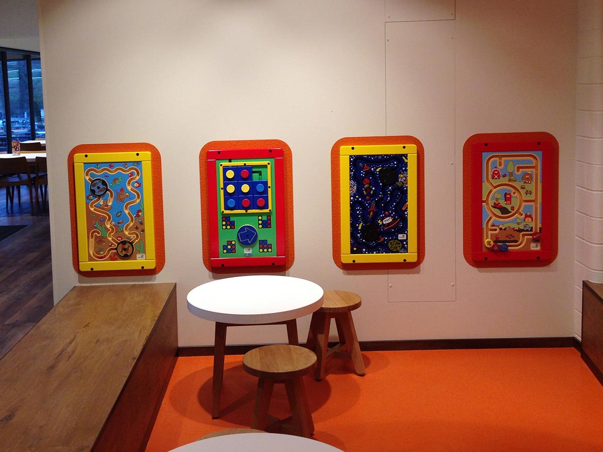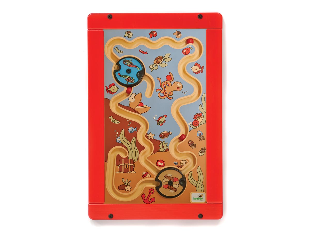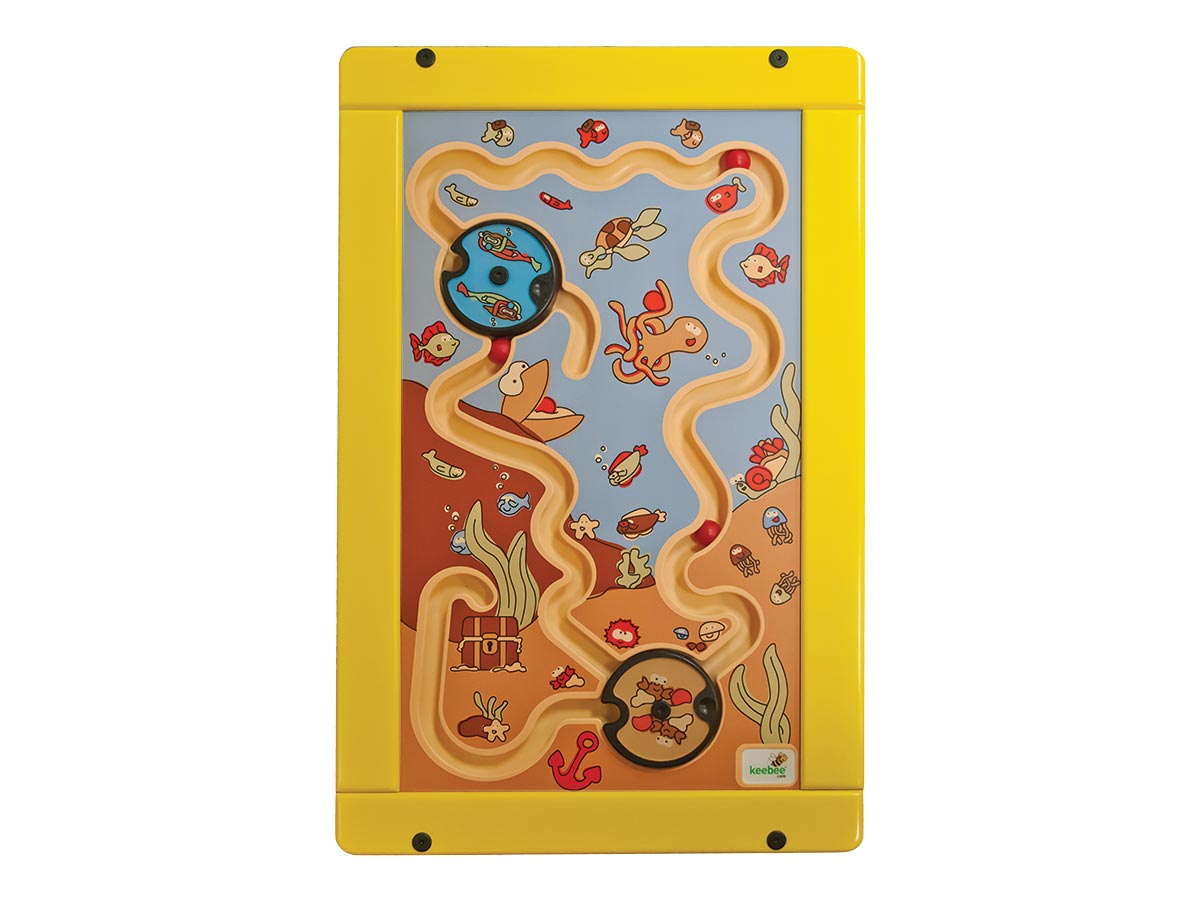 Painel de jogo para fixação directa a parede. Viaja pelo fundo do Oceano entre magníficas criaturas marinhas. Moldura em MDF na cor amarela RAL 1023 ou vermelha RAL 3020. Percursos de bola com faixas recortadas.